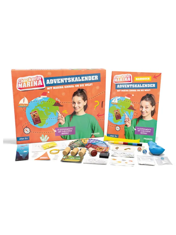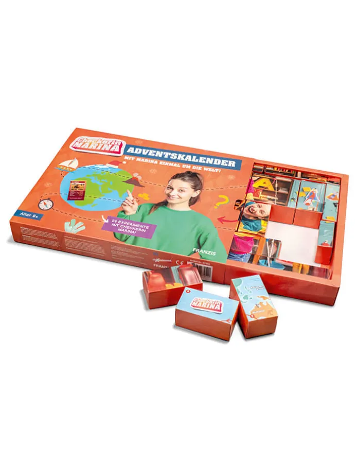 Mit dem „Checkerin Marina“-Adventskalender reist du Tag für Tag um die Welt und entdeckst spannende Fakten zu Schifffahrt, Navigation sowie Architektur und Landschaften fremder Länder. Begleite Marina auf ihren Abenteuern und erfahre in 24 Experimenten, wie Seefahrer einst die Weltmeere erkundeten.