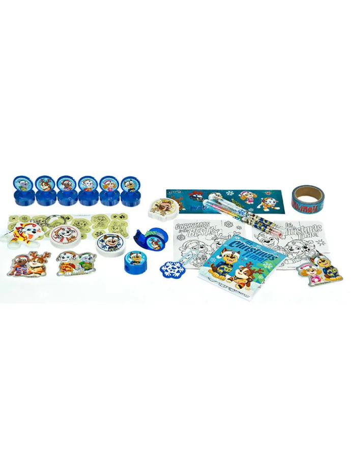 – Inhalt: 6 Mini-Stempel • 2 Puzzles • Paw Patrol Schlüsselanhänger • Klebeband mit Abroller • Lasersticker & Glow-in-the-dark Sticker • 3 große Schaumstoff-Sticker • Spitzer • Mini Pop-Up Bleistift • Mini Wachsmalkreiden • Clip mit Topper • Malblöckchen mit Ausmalmotiven • 3 Radierer in Paw Patrol Formen • Washi Tape