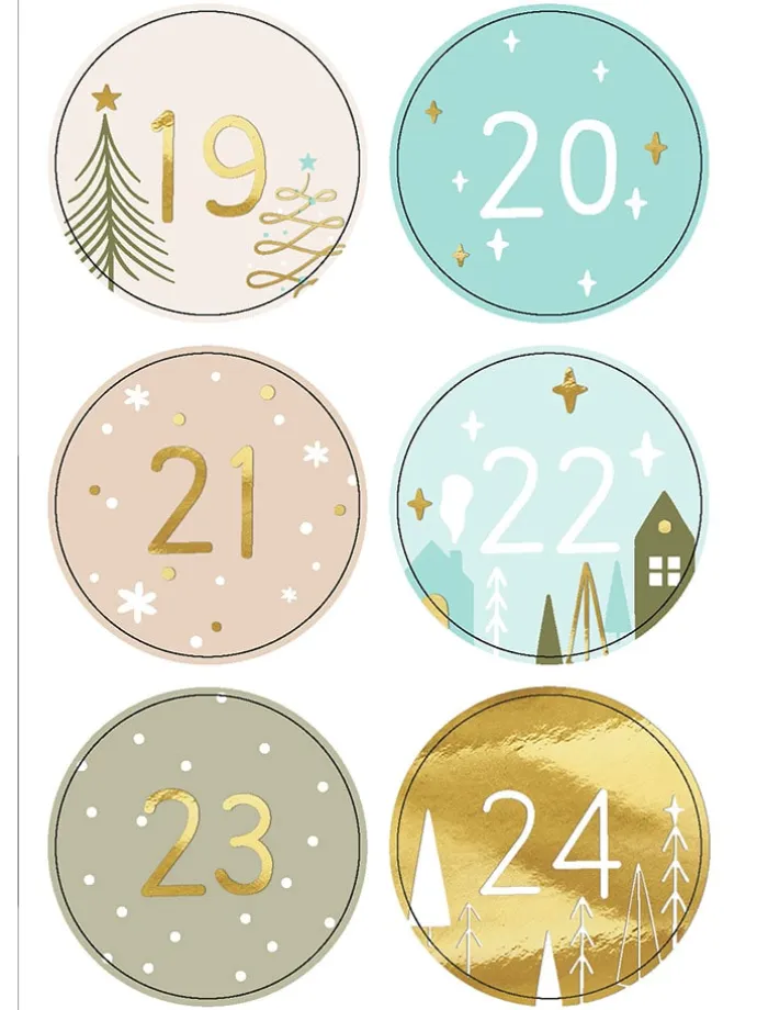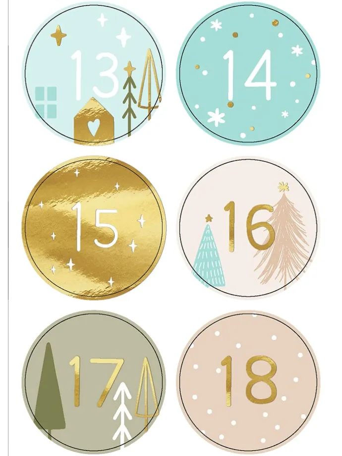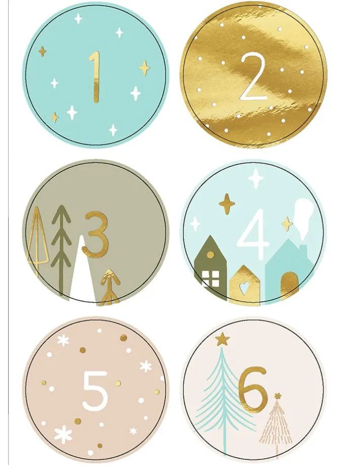 – Inhalt: 24 Tüten aus Kraftpapier sortiert in 3 verschiedenen Designs und 3 Größen, 24 Tags sortiert in 6 Designs, 4 Stickerbögen mit Adventszahlen einseitig bedruckt, Jutekordel und 24 Holz-Wäscheklammern
