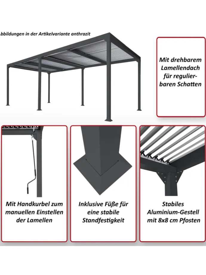 Dieser schöne Garten-Pavillon ist mit einem Dach aus drehbaren Lamellen ausgestattet. Durch die Verwendung von drehbaren Lamellen kann das Sonnenlicht individuell angepasst werden, um ein perfektes Schatten- und Lichtverhältnis zu schaffen. Mithilfe einer Kurbel können die Lamellen einfach und schnell manuell eingestellt werden. Dieser Gartenpavillon bietet somit nicht nur eine stilvolle Optik, sondern auch eine hohe Funktionalität und Widerstandsfähigkeit. Die perfekte Wahl für alle, die ihre Zeit im Freien genießen möchten und dabei nicht auf Komfort und Qualität verzichten wollen.