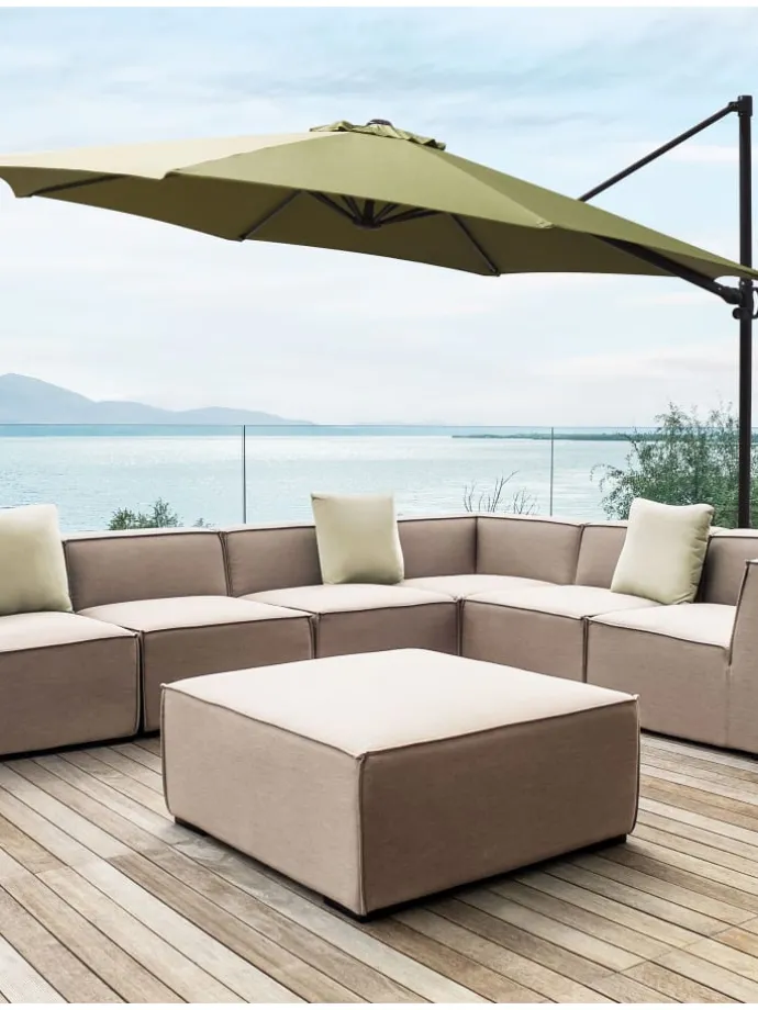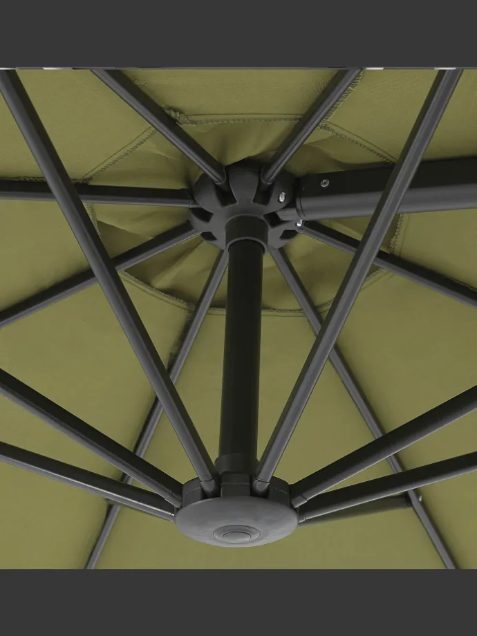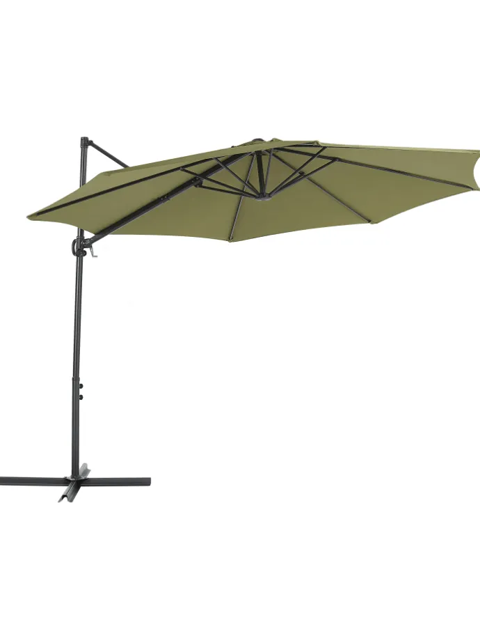 Großer, achteckiger Sonnenschirm mit modernem Design. Im Sommer wird die Terrasse zum Wohnzimmer im Freien, und da gehört ein stylischer Sonnenschirm auf jeden Fall dazu. Durch den seitlichen Fuß und den großen achteckigen Schirm findet sich hier immer ein schattiger Platz für Ihre Gartenmöbel. Das Modell ist mit einem robusten Mast aus Aluminium und einer strapazierfähigen Bespannung ausgestattet. Durchdachte Technik ermöglicht leichtes Öffnen und Schließen des Schirms mit einem Kurbelmechanismus. Ein robuster Kreuzfuß und eine praktische Windhaube sorgen für stabilen Stand. Zudem lässt sich der Arm platzsparend einziehen.