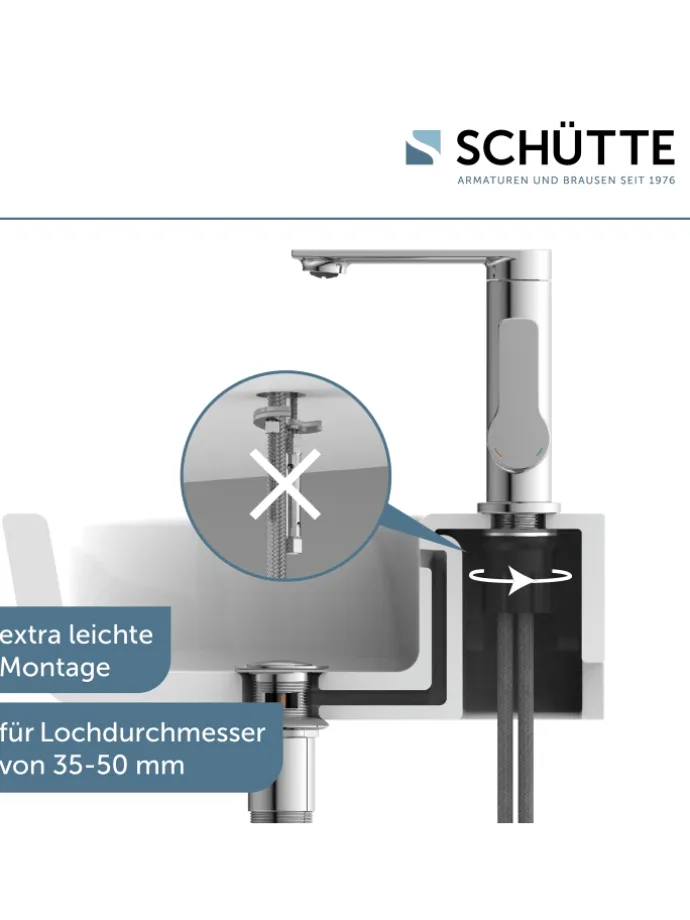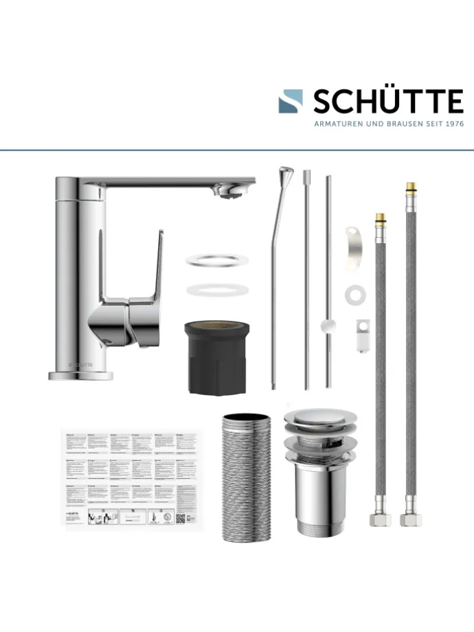Im Lieferumfang enthalten ist ein vollständiges Montageset und eine mehrsprachige, bebilderte Montageanleitung. Die korrosionsbeständigen Anschlussschläuche (400 mm) an das Hauswassersystem sind flexibel und leicht zu montieren.
