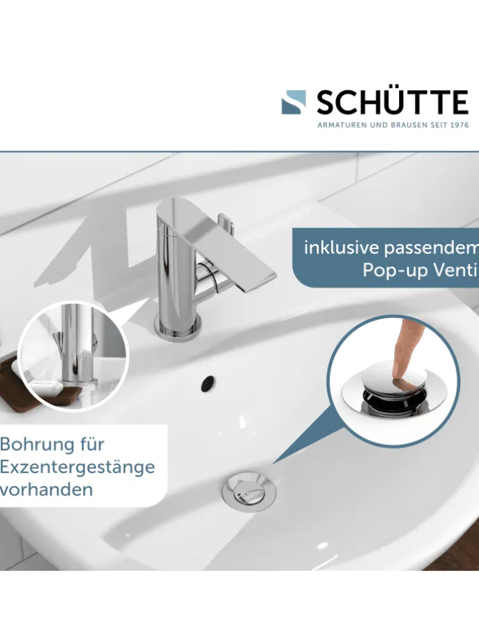 Der Wasserhahn Bad verfügt über eine Waschbecken Ablaufgarnitur mit Pop Up Ablaufventil. Bequem per Fingerdruck den Abflussstopfen öffnen und schließen. Passend zu allen Waschtisch-Siphons mit 11/4? – Ø ca. 4 cm Anschluss.