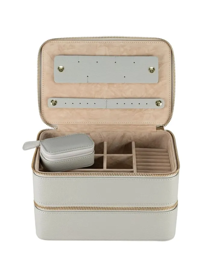 Dieser edle Schmuckkasten von Windrose bietet stilvolle Aufbewahrung für Ihre Schmuckschätze. Mit zwei großzügigen Hauptfächern und speziellen Fächern für verschiedene Schmuckarten hält er alles geordnet bereit. Zwei herausnehmbare Etuis bieten Flexibilität für unterwegs, während das dezente Windrose-Logo auf der Front für Eleganz steht. Sicherer Reißverschluss inklusive.