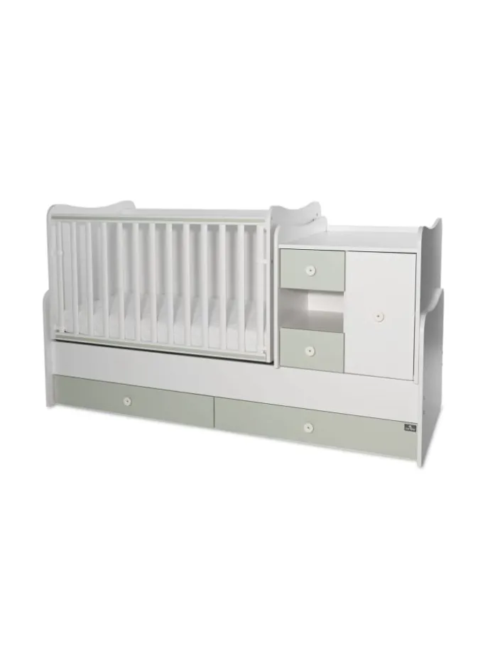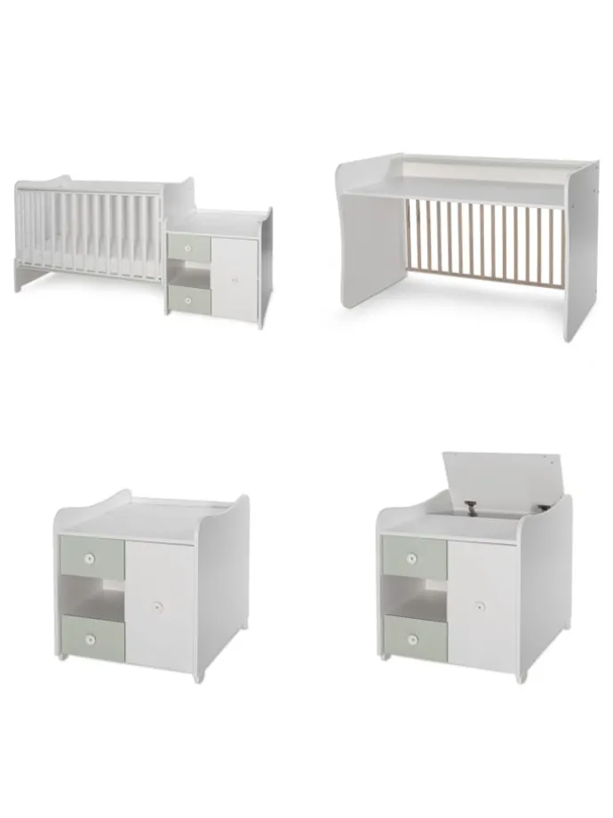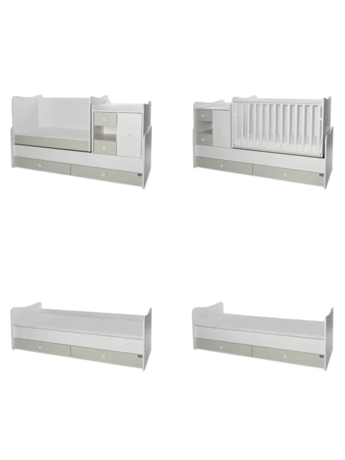 Das Baby- und Jugendbett Mini und Max für 2 Kinder von Lorelli ist für Geschwister ideal, da zwei Betten im Lieferumfang enthalten sind. Sie können das Babybett nach unten separat setzen und haben ein weiteres Jugendbett für das größere Kind. Die Multifunktionskommode mit Wickeltisch kann links oder rechts vom Bett angebracht werden. Der Matratzenrahmen ist beim Babybett in zwei unterschiedlichen Höhen montierbar. Das Babybett verfügt über eine Schaukelfunktion, die sich jederzeit fixieren lässt. Das Bett kann ebenso zum Kinder- oder Jugendbett mit Schreibtisch umgebaut werden.