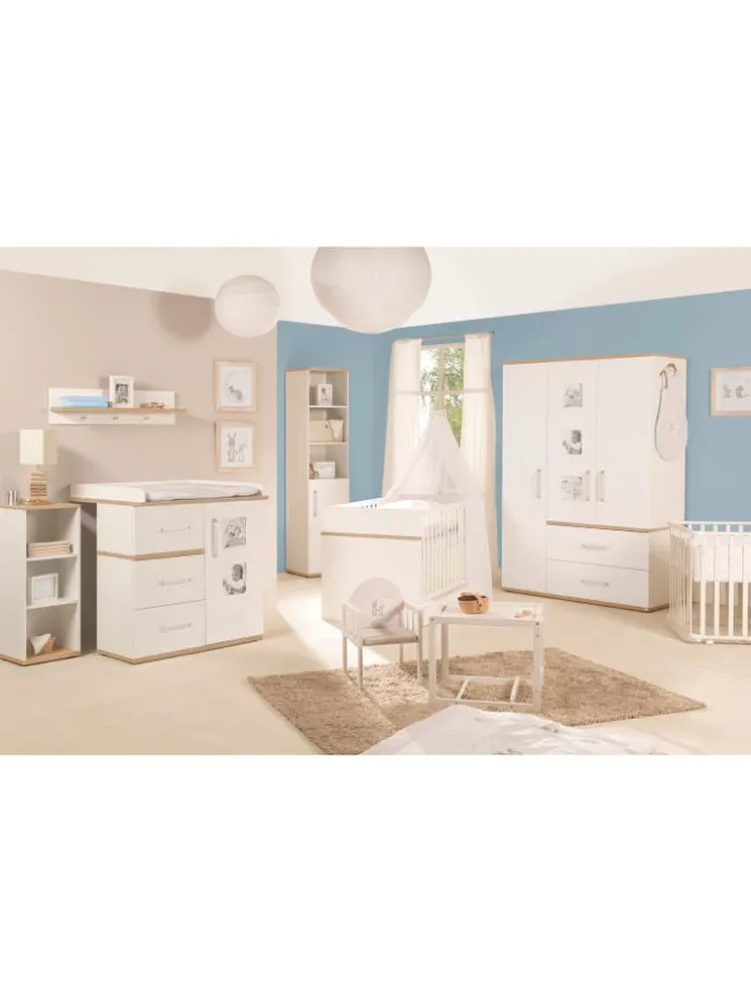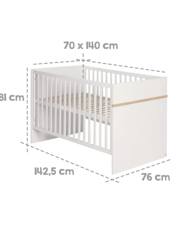 Das roba Kinderzimmerset ‚Pia‘ überzeugt mit seinem zeitlosen Design mit Korpus und Fronten im Dekor ‚Weiß‘ sowie Dekorelementen in ‚Sanremo Eiche‘ und ist ein Traumzimmer für Babys und Kinder. Das Set besteht aus einem Kombi-Kinderbett und einer breiten Wickelkommode. Das mitwachsende Kinderbett kann mit separat erhältlichen Umbauseiten (Art. Nr. 10011WE) zum Juniorbett umgebaut werden. So findet es bis zum 7. Lebensjahr (bzw. einem Gewicht von 50 kg) Verwendung. Besonders angenehm um Ihr Baby aus dem Bett zu heben ist die obere Position des 3-fach höhenverstellbaren Gitterbetts. Die 3 herausnehmbaren Schlupfsprossen ermöglichen Ihrem Kind den sicheren Ein- und Ausstieg. Die Wickelkommode mit Wickelansatz macht mit ihrer angenehmen Wickelhöhe von 94 cm die Babypflege für Eltern und Baby zum Vergnügen. Ohne Wickelansatz dient der Wickeltisch als Kommode. Die Kindermöbelserie ‚Pia‘ ist eph zertifiziert und trägt das Qualitätssiegel blauer Engel, das garantiert, dass alle verwendeten Materialien höchste Ansprüche an Umwelt-, Gesundheits- & Gebrauchseigenschaften erfüllen. Für besonderen Komfort sorgt die Tür- und Schubladendämpfung. Die Kindermöbelserie ‚Pia‘ ist in Deutschland entwickelt und in der EU produziert. Maße Bett H x B x T: 81 x 76 x 143 cm. Liegefläche 70 x 140 cm. Maße Wickelkommode H x B x T: 102 x 117 x 78 cm.