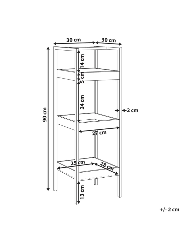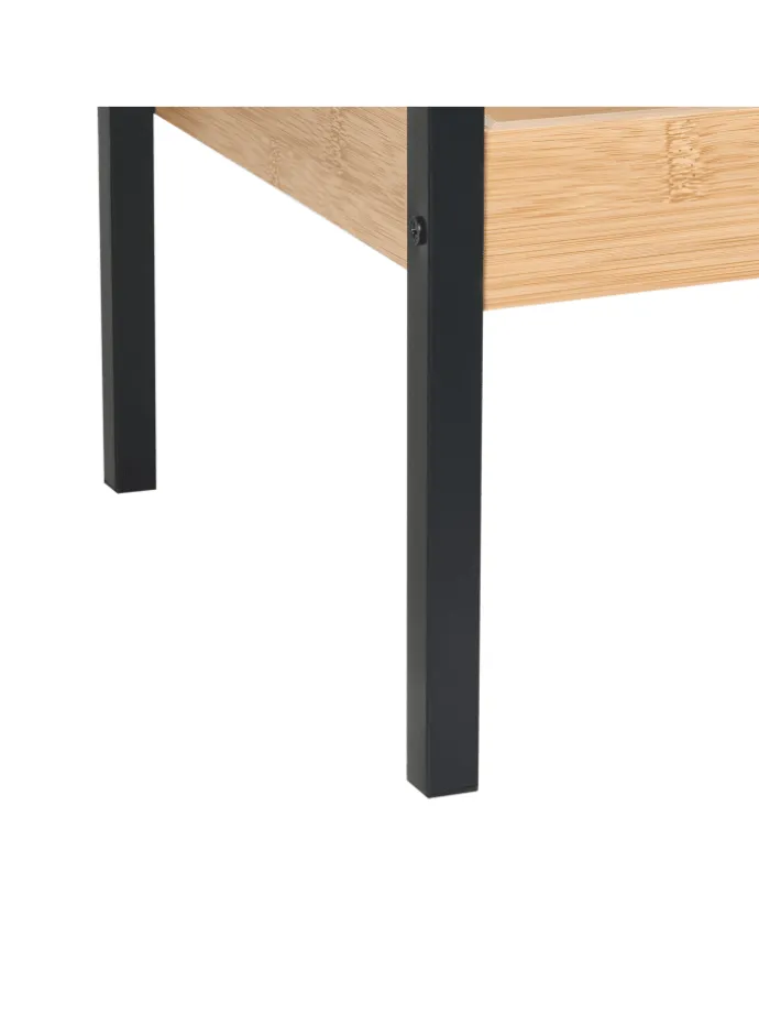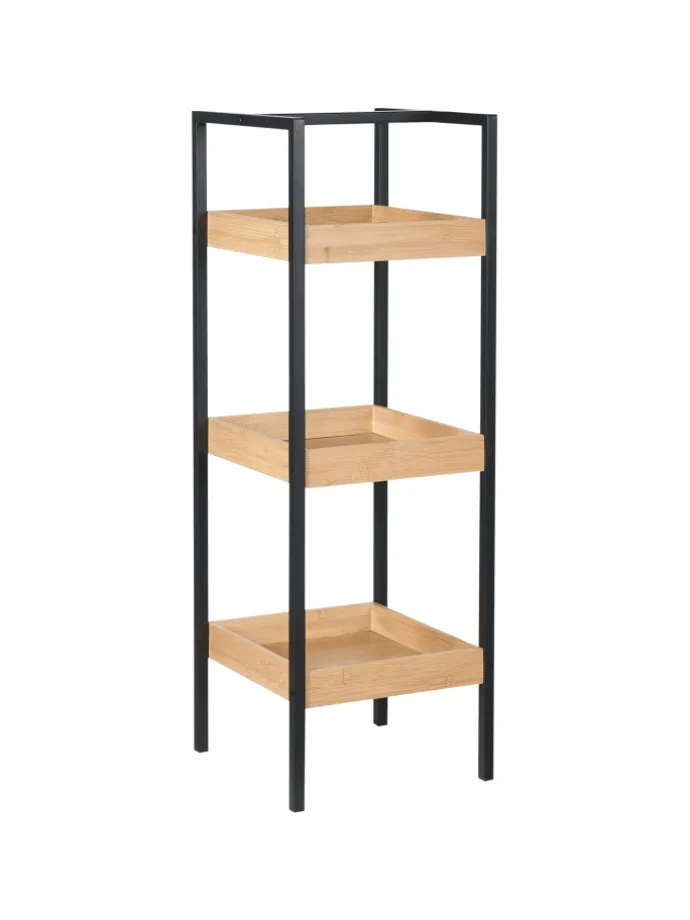 Badezimmer- Aufbewahrungssystem mit drei Ablagen. Dieses praktische Badezimmerregal mit offenen Fachböden ist eine elegante Lösung zur Aufbewahrung von Handtüchern, Toilettenartikeln und Accessoires. Es kombiniert natürliche Bambusfachböden mit einem robusten Stahlrahmen, der für Langlebigkeit und ein modernes Aussehen sorgt. Dank seiner drei Ablageflächen trägt es dazu bei, Ihr Badezimmer ordentlich zu halten, und bietet gleichzeitig einfachen Zugriff auf Dinge des täglichen Bedarfs.