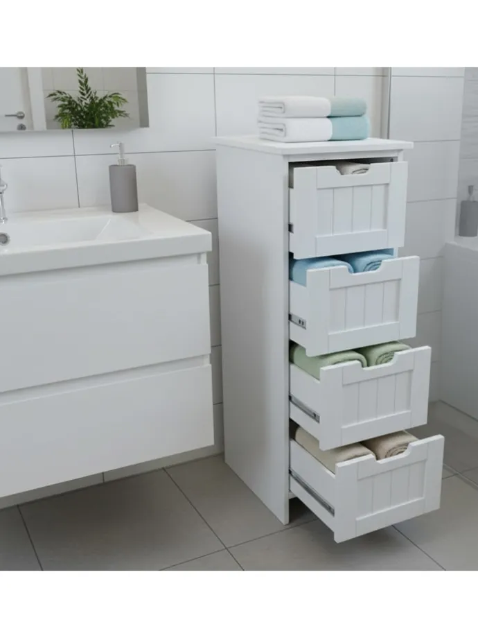 Das kompakte Schränkchen eignet sich ideal zur Aufbewahrung von Handtüchern und Kosmetikartikeln im Badezimmer, macht aber auch als Flurschrank für Accessoires oder als Küchenschrank für Vorräte eine gute Figur. Platzsparend und doch geräumig bietet die Badkommode in 4 Schubladen ausreichend Stauraum. Optisch überzeugt der Bad-Schubladenschrank mit seinem dekorativen Design im Landhausstil und den Füßen, die für einen leichten, eleganten Look sorgen.