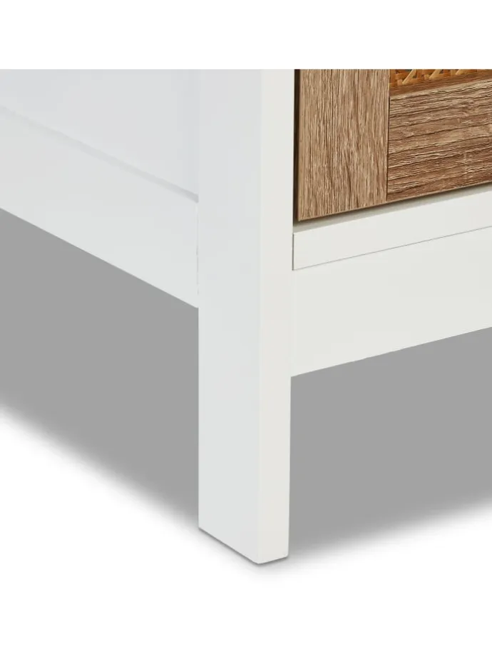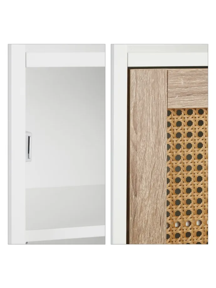 Mit dem kompakten Beistellschrank schaffst Du praktischen Stauraum für Deine Badartikel. Dank der cleveren Kombination aus offenen Ablagen und geschlossenen Fächern kannst Du sowohl Kosmetik und Co. dekorativ platzieren als auch Toilettenpapier, Putzmittel und Co. blickgeschützt hinter der Schranktür verstauen. Diese bildet mit ihrem Rattan-Design optisch einen tollen Kontrast zum weißen Korpus der Badezimmerkommode. Dank seiner schmalen Form eignet sich das Badregal wunderbar für kleine Räume.