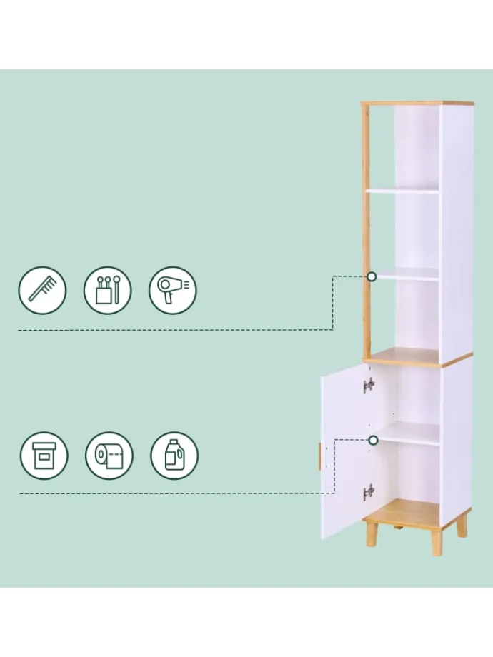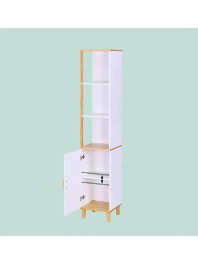 Dieser Badhochschrank überzeugt mit seinem kompakten Format und überraschend großzügigem Stauraum. Drei offene Fächer bieten Platz für Alltagsprodukte, während ein Türfach mit verstellbarem Einlegeboden zusätzliche Aufbewahrungsmöglichkeiten schafft. Der vielseitige Mehrzweckschrank macht sowohl im Bad als auch in der Küche oder im Wohnzimmer eine gute Figur. Mit seiner Kombination aus weißer Oberfläche und natürlichem Bambus verleiht der Hochschrank jedem Raum einen frischen, modernen Look.