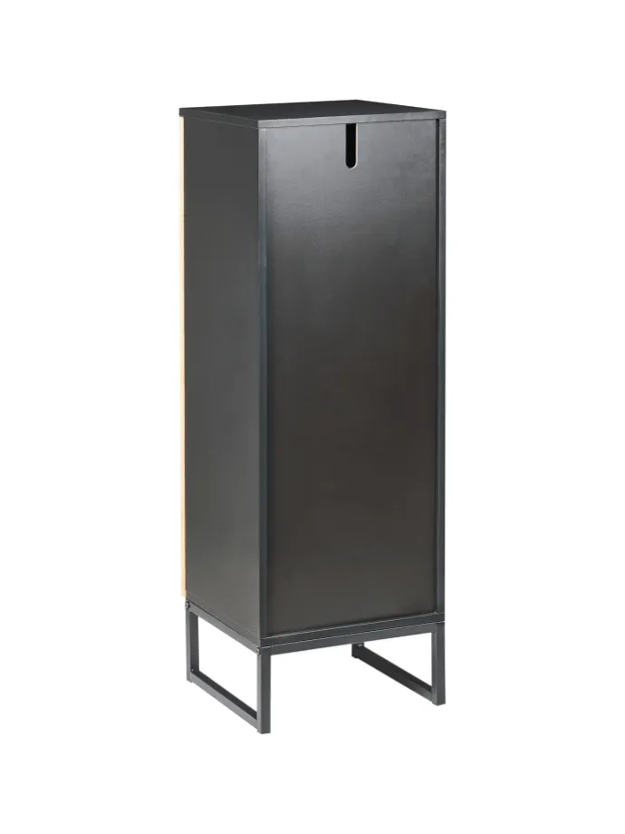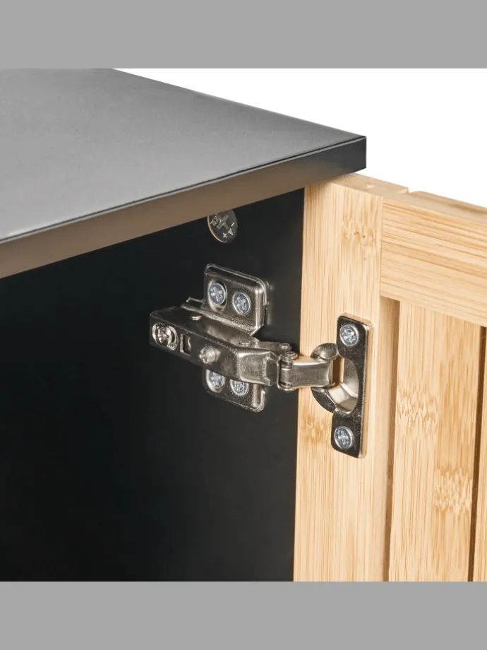 Kleiner Badezimmerschrank mit drei Ablageflächen. Dieser kompakte Schrank ist die ideale Lösung für kleinere Badezimmer, in denen jeder Zentimeter zählt. Die Kombination aus natürlichem Bambusholz und einem mattschwarzen Rahmen verleiht ihm eine stilvolle Optik und setzt einen eleganten und modernen Akzent. Der Schrank ist mit Regalen ausgestattet, die sich hinter einer Tür befinden. Es handelt sich um ein funktionales Möbelstück, das für Ordnung sorgt und dem Interieur gleichzeitig einen einzigartigen Charakter verleiht.