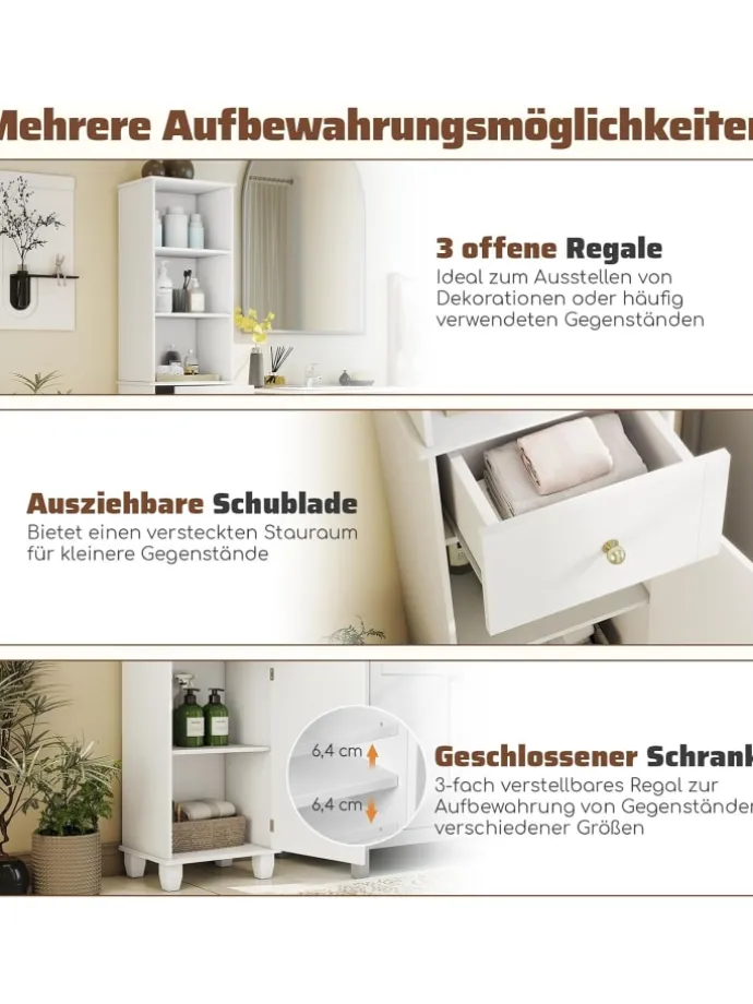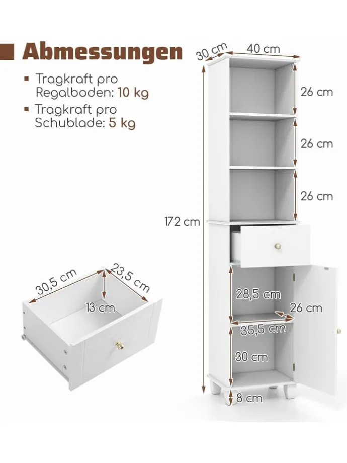 Dieser schlanke, hohe Badschrank vereint ansprechendes Design mit hoher Funktionalität und nutzt den verfügbaren Platz optimal aus. Speziell entwickelt für Bad, Küche oder Wohnzimmer, bietet er zusätzlichen Stauraum, ohne den Raum optisch zu dominieren. Mit drei offenen Regalfächern, einer praktischen Schublade und einem geschlossenen Schrankbereich steht Ihnen viel Platz zur Verfügung. Hinter der Tür befindet sich ein dreifach verstellbares Regal, das sich flexibel an unterschiedlich große Gegenstände anpasst.