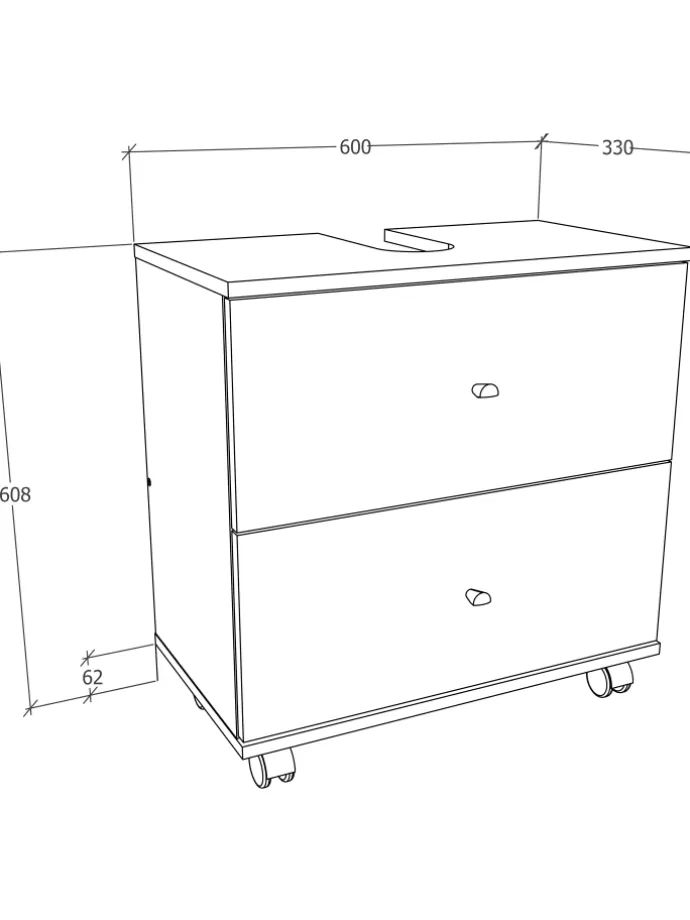 Zwei Schubladen bieten ausreichend uneinsehbaren Stauraum. Die Rollen verleihen dem Möbel eine besondere Optik und sind ein praktischer Alltagshelfer, da der Schrank jederzeit verschoben werden kann.