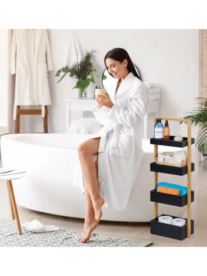 Das Standregal verfügt über ausreichend Stauraum für Badutensilien aller Art, die auf den 4 offenen Ablagen stets griffbereit lagern. Dank seines schmalen Designs ist das Ablageregal dabei auch für kleinere Bäder bestens geeignet. Auch in der Küche, wo es zur Aufbewahrung von Vorräten, Kaffee- und Teedosen dient, macht das Regal eine gute Figur. Durch die dekorative Kombination aus natürlichem Bambus und den mattschwarzen Ablagen ist das Stehregal auch optisch ein Hingucker.