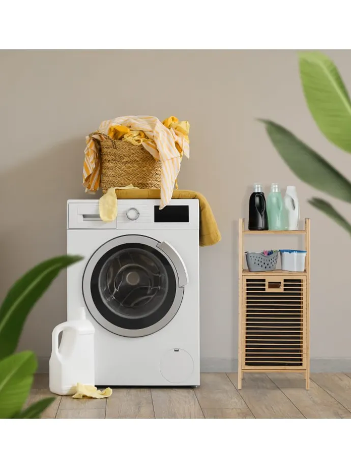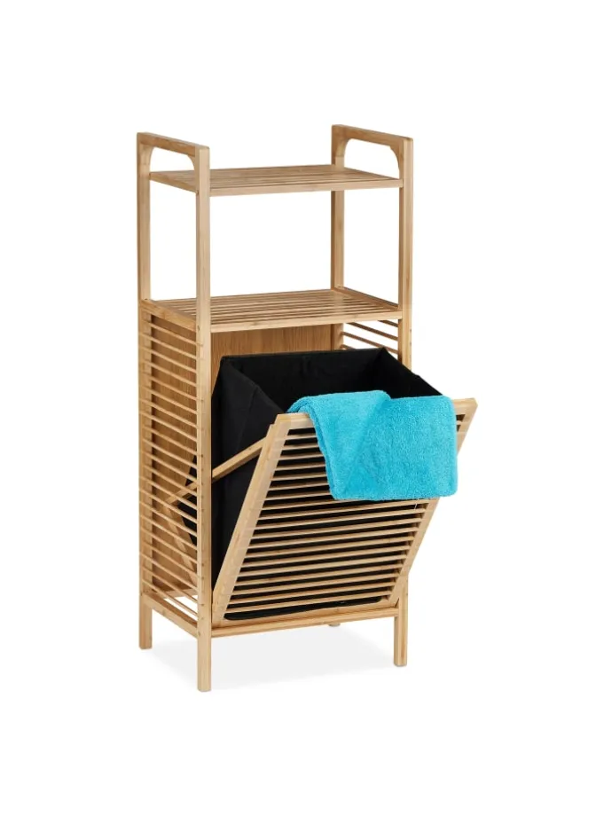 Das Badregal mit integriertem Wäschesammler ist ideal, wenn Du ein kleines Bad mit wenig Platz hast oder Dir eine einfache Wäschetonne nicht mehr ausreicht. Die 2 praktischen Ablagen bieten Dir Abstellflächen für allerlei Badutensilien und mit dem kippbaren Wäschekorb wird Deine Schmutzwäsche ordentlich aufbewahrt. In puncto Design besticht das Badezimmerregal durch natürlichen Bambus, welcher ergänzt wird durch das schlichte Schwarz des herausnehmbaren Wäschebehälters.