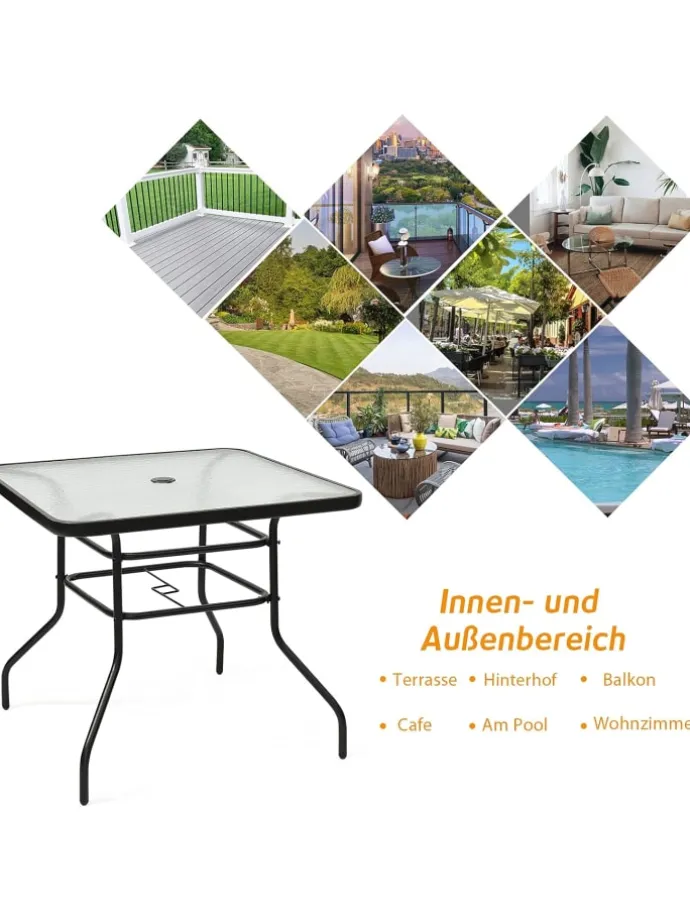 Sein pulverbeschichteter schwarzer Stahlrahmen ist langfristig nutzbar und stabil, mit einer Tragkraft von bis zu 50 kg. Die Tischplatte aus Hartglas trocknet schnell und ist ideal für eine Familienzusammenkunft. In der Mitte befindet sich ein Loch für Sonnenschirme, wodurch Sie Ihren Kaffee auch an heißen Tagen draußen genießen können. Der Kaffeetisch ist geeignet für Gärten, Terrassen und andere Außenbereiche