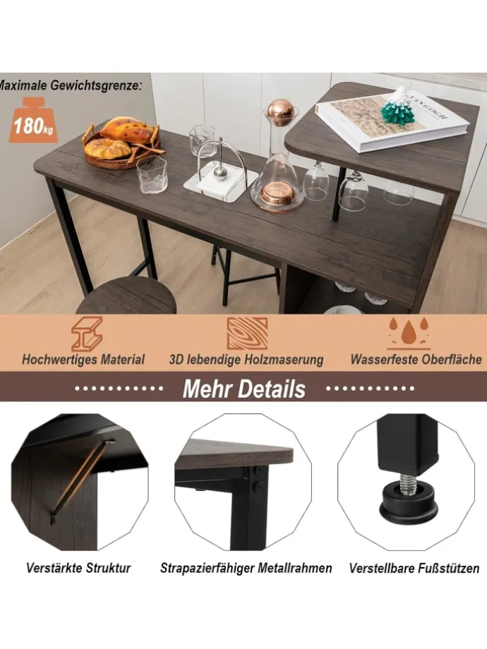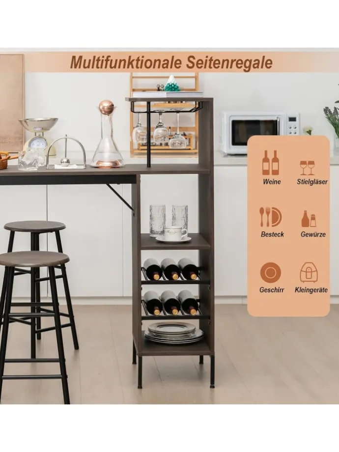 Das rustikale Bartisch- und Hocker-Set wird Ihren Raum schmücken und eine berauschende Atmosphäre schaffen, in der Sie einen Drink genießen können. Der schmale Tisch mit multifunktionalen Seitenablagen kann seinen Zweck erfüllen und bietet klassifizierten Stauraum für Weine, Geschirr und andere Barutensilien.