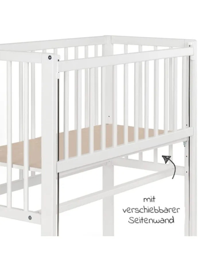 Das Beistellbett Vario 2in1 – Weiß von Fillikid ist ein wahres Multitalent und sorgt dafür, dass Du Dein Kind immer ganz nah bei Dir hast. Mit Hilfe der Gurtfixierung ist das Bettchen ganz einfach und ohne Werkzeug am Elternbett angebracht, sodass Du nachts immer für das Baby da bist. Die Gitterseite kannst Du schnell und einfach nach unten schieben. Dazu drehst Du einfach kurz die Schrauben auf. Ans Bett gestellt, kannst Du das Baby schnell zu Dir nehmen – ohne aufstehen zu müssen.