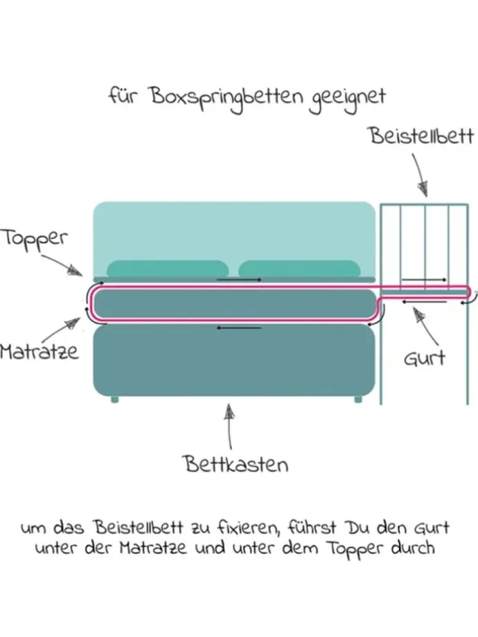 – PASST AUF STANDARD- UND BOXSPRINGBETTEN: Die Liegehöhe ist 5-fach verstellbar. Dadurch eignet sich das Vario für Elternbetten mit einer Matratzenhöhe von 54-70 cm. Per Gurtbefestigung ist es mit wenig Aufwand fest verankert – auch bei Boxspring.