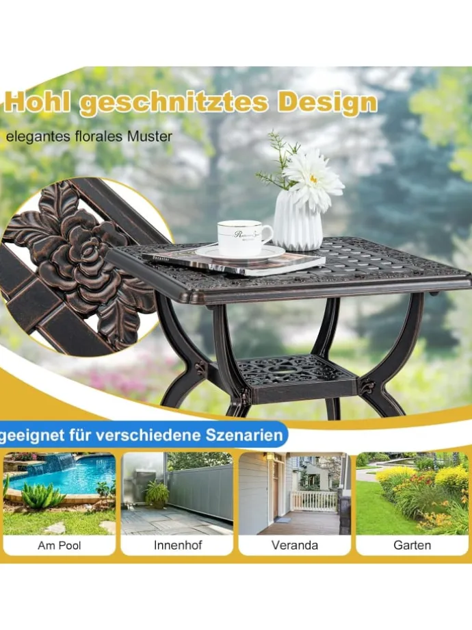 Tauchen Sie ein in den Charme vergangener Zeiten mit unserem exquisiten Beistelltisch für den Außenbereich. Er besteht aus rostfreiem Aluminiumguss, ist rostbeständig und überdauert die Zeit. Genießen Sie das zweistufige Design mit einer geräumigen Tischplatte und einer praktischen Ablagefläche für alle wichtigen Outdoor-Utensilien – Getränke, Snacks oder Vasen. Vielseitig und faszinierend schmückt der Tisch perfekt jeden Rückzugsort im Freien. Und sie brauchen sich keinesfalls um die Stabilität zu sorgen. Unser Kaffeetisch ist mit verstellbaren Fußpolstern ausgestattet, die für zuverlässigen Halt sorgen. Genießen Sie seinen mühelosen Charme und verhelfen Sie Ihrem Außenbereich zu neuem Glanz.