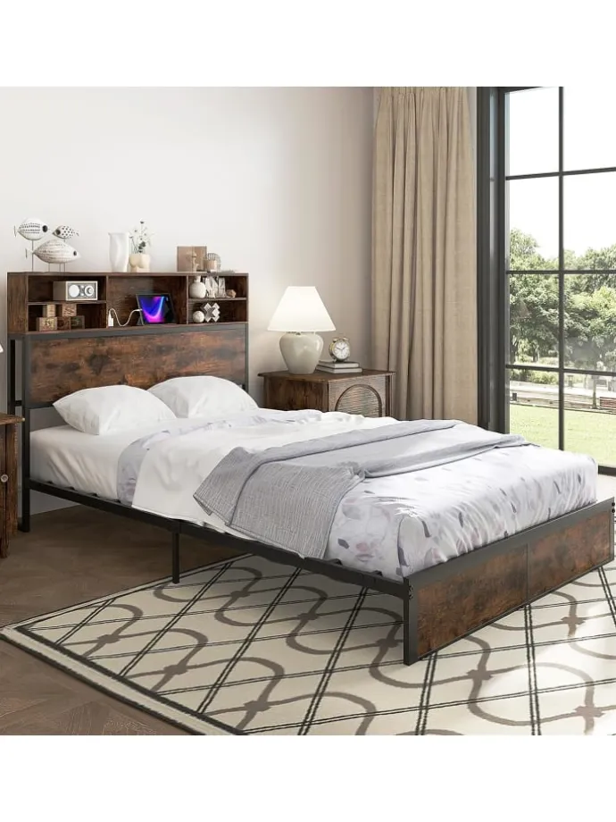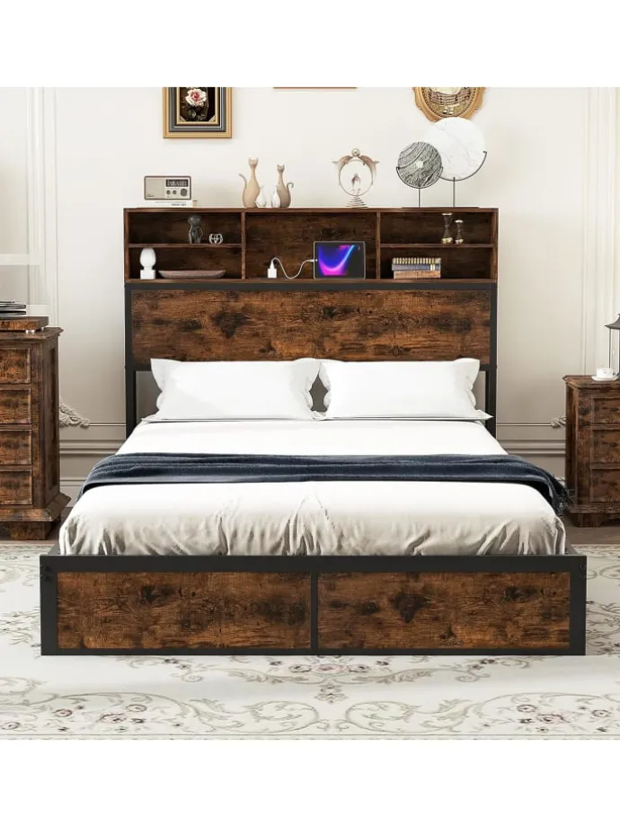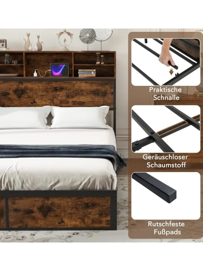 Machen Sie sich keine Sorgen wegen einer leeren Batterie! Der Bettrahmen verfügt über eine versenkte Steckdosenleiste im Kopfteil, sodass Sie Ihre Geräte ganz einfach aufladen können. Das Kopfteil mit Stauraum bietet zusätzlichen Platz zum Ordnen Ihrer wichtigen Dinge. Dieses aus robusten Metalllatten gefertigte Untergestell ist auf Langlebigkeit ausgelegt. Darüber hinaus bietet dieser Bettrahmen mit seinen soliden Latten und zusätzlichen mittleren Metallbeinen eine solide Stütze. Der geräuschlose Schaumstoff sorgt für einen ruhigen und ungestörten Schlaf.