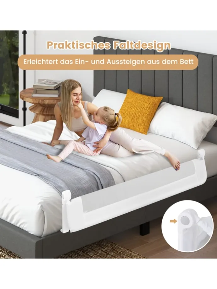 Unser Bettgitter wird Ihrem Kind effektiv helfen zu schlafen. Der robuste Eisenrahmen sowie die faltbaren, T-förmigen Stützbeine erhöhen die Stabilität dieses Schutzgitters und bieten Ihrem Baby die höchstmögliche Sicherheit. Das waschbare Oxford-Gewebe und das Meshgewebe, das eine gute Luftzirkulation unterstützt, sind angenehm weich und schenken Ihrem Baby einen hohen Komfort. Die weiche PP Baumwolle und die gewissenhaft abgerundeten Kanten schützen die Haut Ihres Kindes zudem effektiv vor Verletzungen. Das Herunterklappbare Design erleichtert es außerdem nicht nur Ihrem Kind, in sein Bett zu gelangen, sondern hilft auch Ihnen beim Wechseln der Bettwäsche. Darüber hinaus lässt sich dieses Schutzgitter an Betten verschiedenster Größen anbringen und ist so das beste Geschenk für Ihr Kind.
