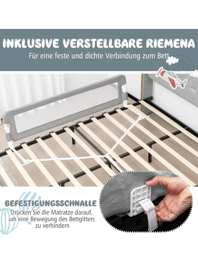 Unser Bettgitter wird Ihrem Kind effektiv helfen zu schlafen. Der robuste Eisenrahmen sowie die faltbaren, T-förmigen Stützbeine erhöhen die Stabilität dieses Schutzgitters und bieten Ihrem Baby die höchstmögliche Sicherheit. Das waschbare Oxford-Gewebe und das Meshgewebe, das eine gute Luftzirkulation unterstützt, sind angenehm weich und schenken Ihrem Baby einen hohen Komfort. Die weiche PP Baumwolle und die gewissenhaft abgerundeten Kanten schützen die Haut Ihres Kindes zudem effektiv vor Verletzungen. Das Herunterklappbare Design erleichtert es außerdem nicht nur Ihrem Kind, in sein Bett zu gelangen, sondern hilft auch Ihnen beim Wechseln der Bettwäsche. Darüber hinaus lässt sich dieses Schutzgitter an Betten verschiedenster Größen anbringen und ist so das beste Geschenk für Ihr Kind.