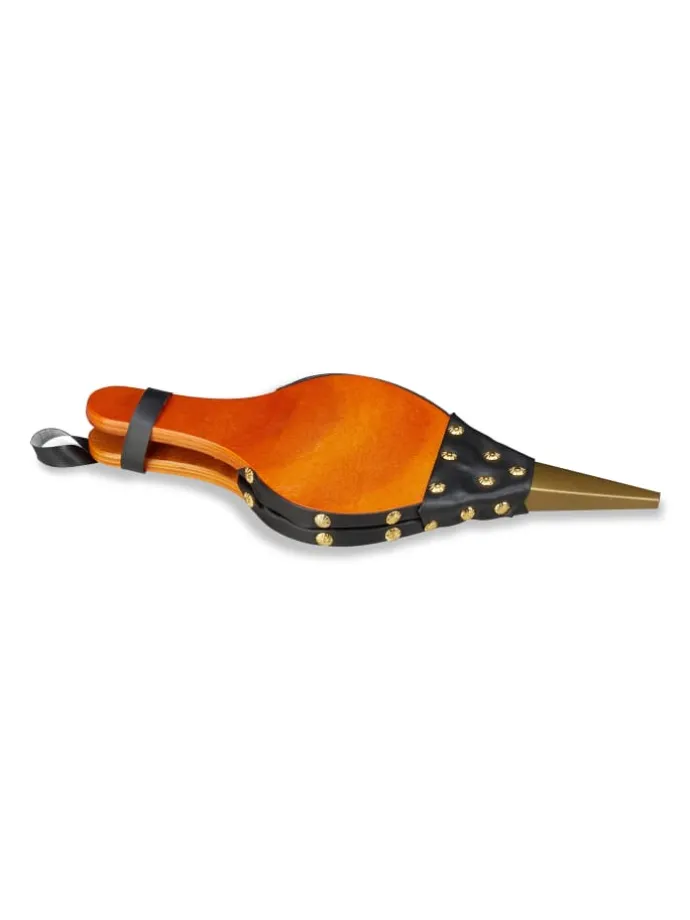 Mit dem Blasebalg haben Sie Ihr Kaminfeuer oder die Glut im Grill schnell und einfach angefacht. Mit beiden Händen bedient entsteht ohne großen Kraftaufwand ein starker Luftzug. Wird der Feuerbalg gerade nicht benötigt, kann er einfach an der praktischen Schlaufe aufgehangen werden. Das rustikale, traditionelle Design mit goldenen Ziernägeln, schwarzem Kunstleder und dem Korpus in Holzoptik ist ein dekorativer Hingucker neben dem Kamin oder Ofen.