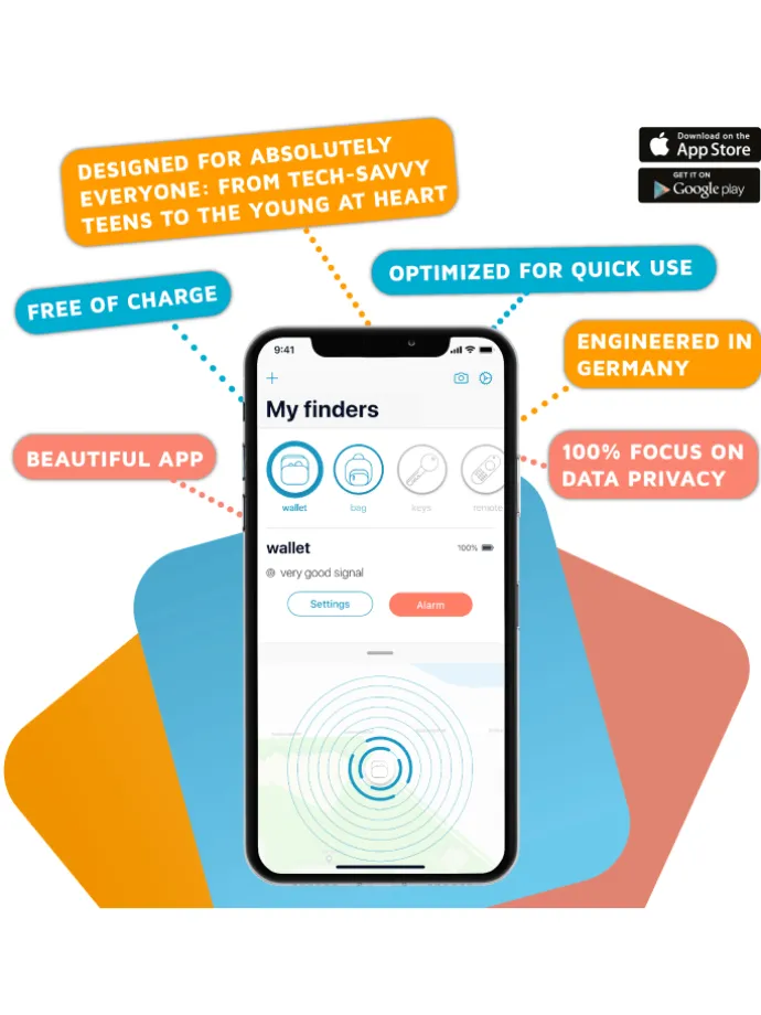 Der finder kombiniert die analoge mit der digitalen Welt und ist das perfekte Geschenk. Ganz egal, welche wichtigen Gegenstände Du nicht wiederfindest – die nervenaufreibende und langwierige Suche gehört nun der Vergangenheit an! Ob Schlüssel, Geldbörse, Fernbedienung, Handy oder Tablet – Der finder lässt sich dank mitgeliefertem Klebepad und Befestigungsband überall innerhalb weniger Sekunden anbringen.