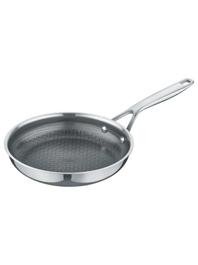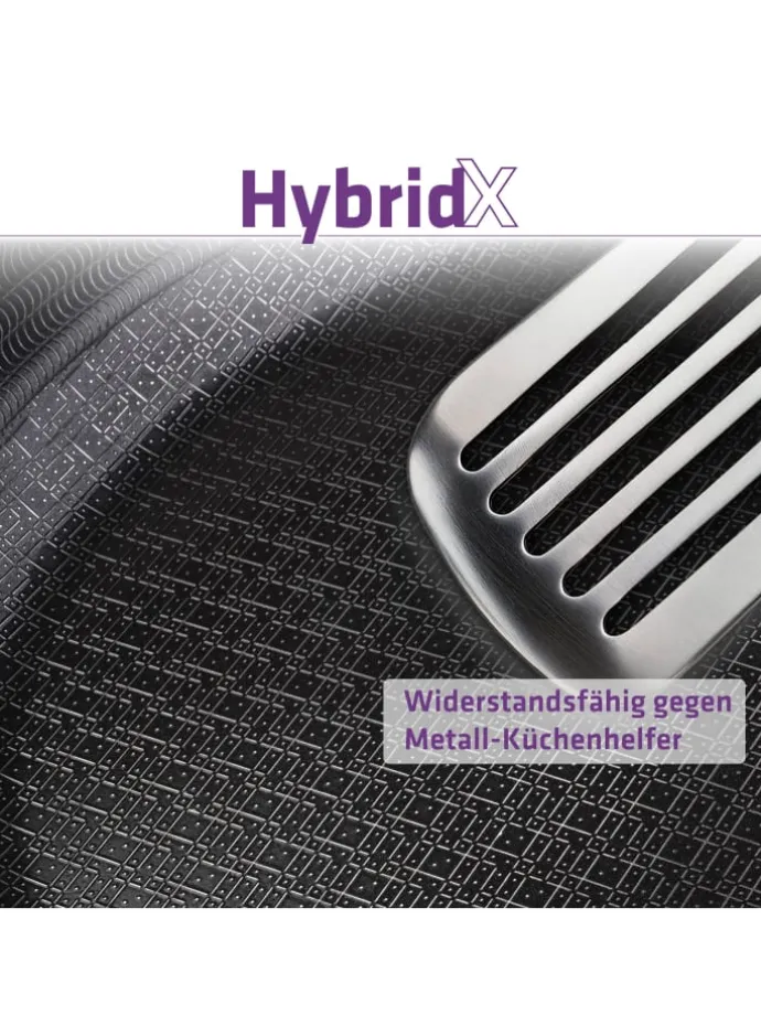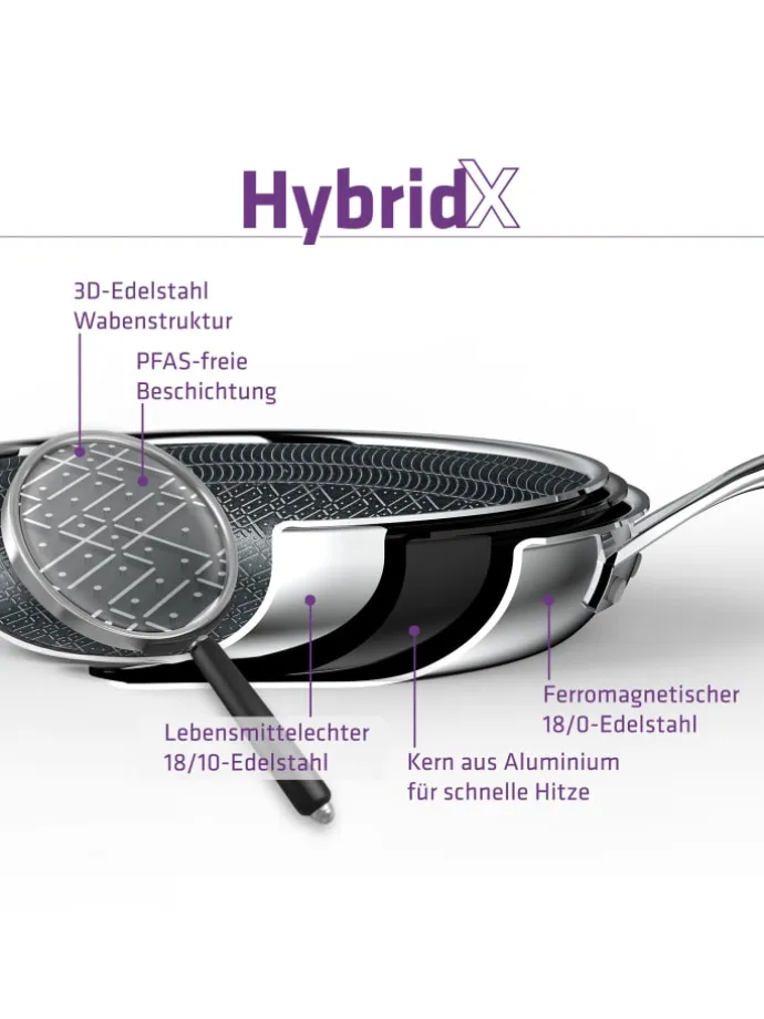 HybridX Bratpfanne – Die perfekte Kombination aus Robustheit und Vielseitigkeit Die HybridX Bratpfanne wurde speziell für ambitionierte Hobbyköche und Profis entwickelt, die keine Kompromisse bei Qualität und Vielseitigkeit eingehen wollen. Dank modernster Materialtechnologien und innovativem Design ist sie die ideale Wahl für eine Vielzahl von Kochstilen und Gerichten. Verfügbar in den Größen 20 cm, 24 cm und 28 cm, bietet die HybridX Pfanne für jede Situation die passende Lösung. Vorteile der HybridX Bratpfanne: Hybrid-Technologie für maximale Flexibilität Die HybridX Bratpfanne vereint die besten Eigenschaften von Edelstahl und Antihaft-Technologie. Das 3-Schicht-Material aus zwei Lagen Edelstahl mit einem Kern aus Aluminium sorgt für eine extrem schnelle und gleichmäßige Wärmeverteilung sowie eine lange Lebensdauer, während die hybride Antihaft-Beschichtung dafür sorgt, dass selbst empfindliche Speisen wie Fisch oder Eier mühelos gelingen. Für letztere bitte niedrige Temperatur und etwas Fell/Öl verwenden. Für alle Herdarten geeignet Ob Induktions-, Gas-, Elektro- oder Ceranherd – die HybridX Bratpfanne ist für alle Herdarten ideal geeignet. Durch ihre hervorragenden Wärmeeigenschaften ist sie besonders effizient und hilft dir, deine Kochzeit zu optimieren. Uneingeschränkt Ofenfest Du kannst deine Gerichte nicht nur auf dem Herd, sondern auch direkt im Ofen zubereiten. Die HybridX Pfanne ist uneingeschränkt backofengeeignet und ermöglicht so nahtloses Garen und Braten – perfekt für Rezepte, die eine Kombination aus Anbraten und Backen erfordern. Langlebige Antihaft-Beschichtung in hybrider Ausführung Die HybridX Pfanne ist mit einer modernen Antihaft-Beschichtung ausgestattet, die langlebig und besonders widerstandsfähig gegen Kratzer ist. Diese Beschichtung ist auch für die Verwendung von Metall-Küchenhelfern geeignet und zudem optimal zu reinigen – egal ob per Hand oder in der Spülmaschine. Ergonomischer Griff für sicheren Halt Der hitzebeständige, doppelt genietete Stiel liegt perfekt in der Hand und sorgt für ein sicheres und angenehmes Handling, selbst bei hohen Temperaturen. Damit kannst du präzise und kontrolliert arbeiten, ohne dich um heiße Oberflächen sorgen zu müssen. Verfügbar in verschiedenen GrößenDie HybridX Bratpfanne gibt es in den Größen 20 cm, 24 cm und 28 cm – passend für jede Küche und jedes Kochvorhaben. Ob du kleine Portionen für den schnellen Snack oder große Gerichte für die ganze Familie zubereiten möchtest, die HybridX Pfanne bietet dir die nötige Flexibilität.