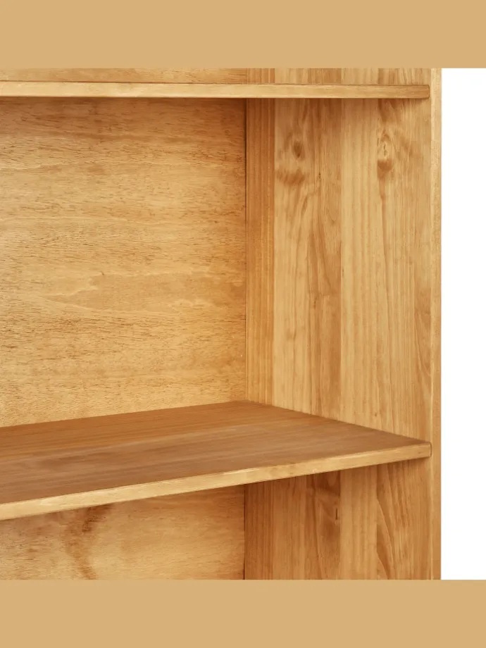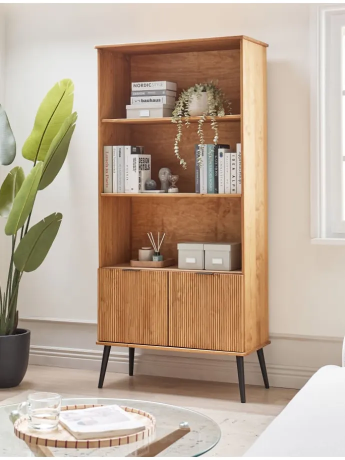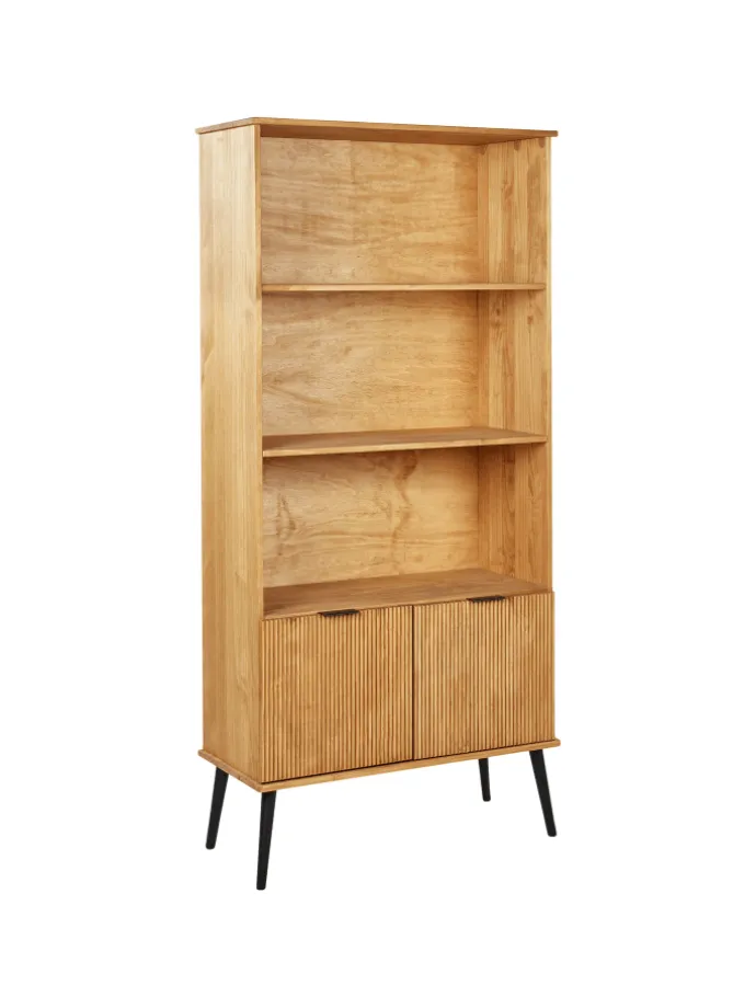 Modernes Regal mit geriffelten Schranktüren. Dieses rustikale Bücherregal aus hellem Kiefernholz verleiht jedem Raum natürlichen Charme. Die zwei geriffelten Türfronten setzen einen stilvollen Akzent, während die geräumigen Einlegeböden ausreichend Stauraum für verschiedene Gegenstände bieten. Das schlichte, aber elegante Design in Kombination mit den stabilen schwarzen Beinen macht es zur perfekten Wahl für Schlafzimmer oder Wohnzimmer und sorgt für eine warme, einladende Atmosphäre.