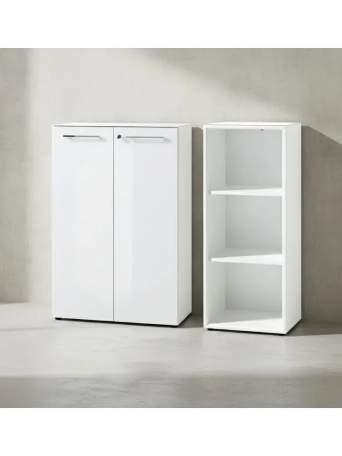 Set bestehend aus einem Aktenschrank und einem Aktenregal; Aktenschrank mit abschließbaren Türen, dahinter zwei feste Böden; ein Aktenregal mit zwei festen Böden und 3D-Rahmen mit Gehrung MDF-ummantelt; insgesamt zwei Relinggriffe aus Chrom und acht schwarze Möbelgleiter; Dekor in Weiß; Fronten und Oberböden mit Glasauflage, Türdämpfung, Melaminharzbeschichtung, hochwertige ABS-Kanten, Made in Germany.