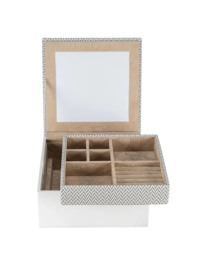 Der edle Schmuckkasten von Windrose vereint Stil und Funktionalität: Vielseitige Fächer bieten Platz für jeden Schmucktyp, und der integrierte Spiegel erleichtert das Anlegen Ihrer Lieblingsstücke. Mit seinem eleganten Logo auf der Front und einem sicheren Magnetverschluss ist dieser Schmuckkasten ein stilvolles Highlight für jede Schmucksammlung.