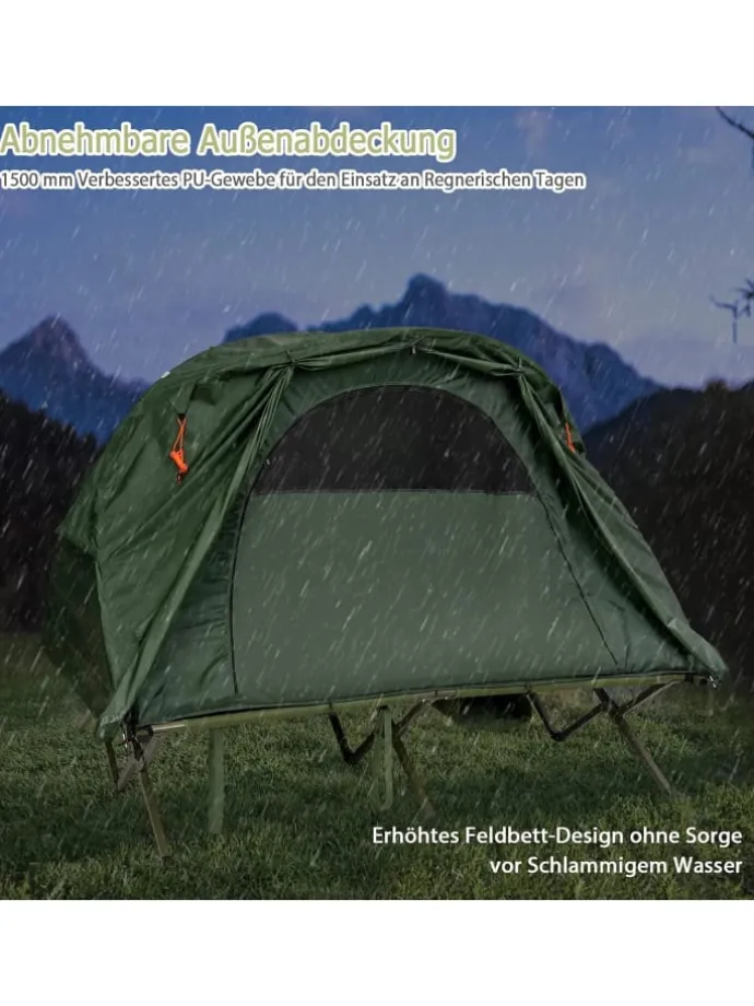 Das Außenzelt hilft, die Wärme im Inneren zu speichern, sodass dieses Campingbett auch in kälteren Jahreszeiten verwendet werden kann.