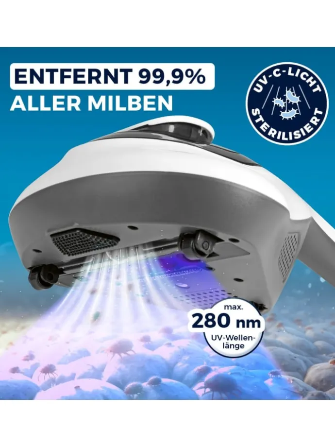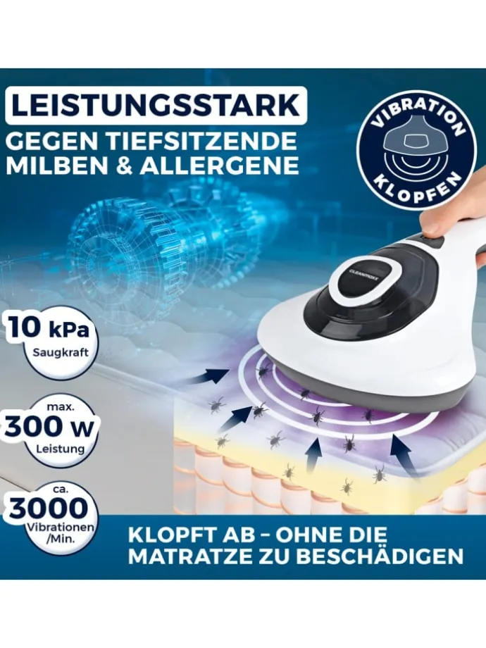 Mit einer Saugkraft von 10 kPa und bis zu 3000 Vibrationen pro Minute rüttelt der CLEANmaxx Milbensauger Vibration Milben und Allergene sanft auf und entfernt sie gründlich. Der große Reinigungsbereich ermöglicht eine schnelle und effektive Reinigung großer Oberflächen, ob bei Matratzen, Bettdecken, Sofas, Kissen oder auch Teppichen. Die UV-C-Lichttechnologie sterilisiert Oberflächen ganz ohne den Einsatz von Chemikalien. Dies sorgt für eine gründliche Desinfektion und bietet somit auch Schutz vor Keimen und Bakterien.
