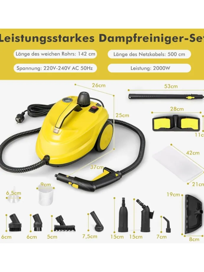 Unser 2000-Watt-Dampfreiniger erreicht bei Zugabe von 1,8 Litern Wasser eine beeindruckende Temperatur von 160 °C und einen Dampfdruck von bis zu 5 bar. Unser Produkt bietet eine effektive Methode zur Entfernung hartnäckiger Flecken auf Teppichen, Böden, Fenstern, Vorhängen und schwer zugänglichen Ecken.
