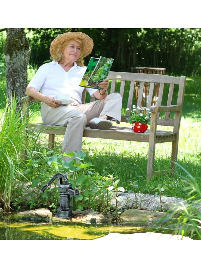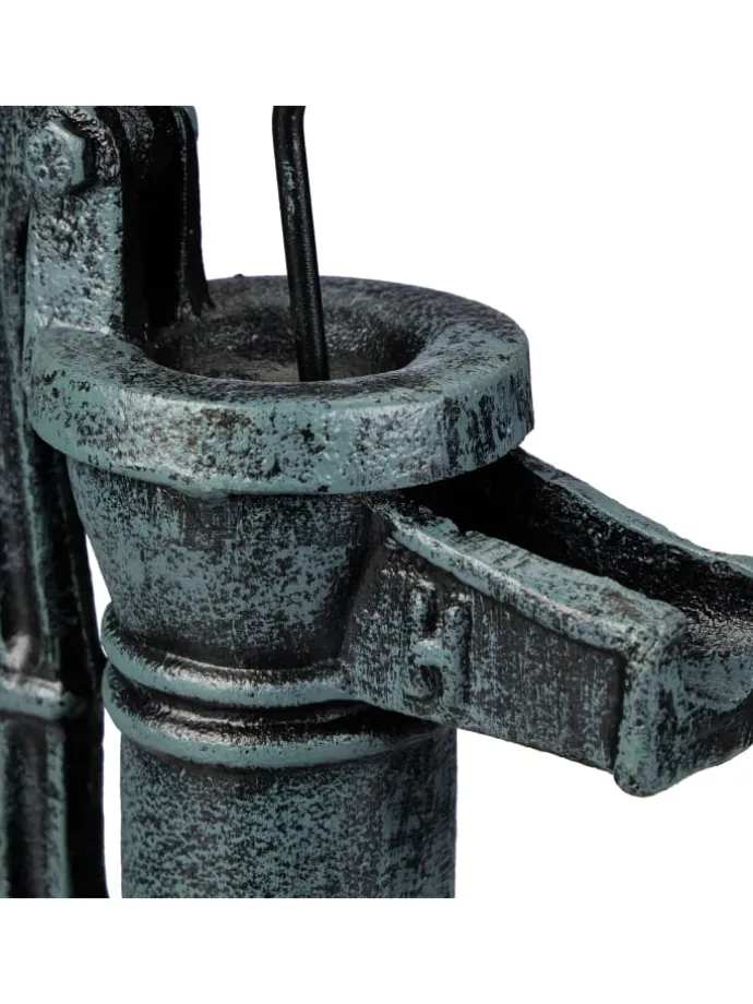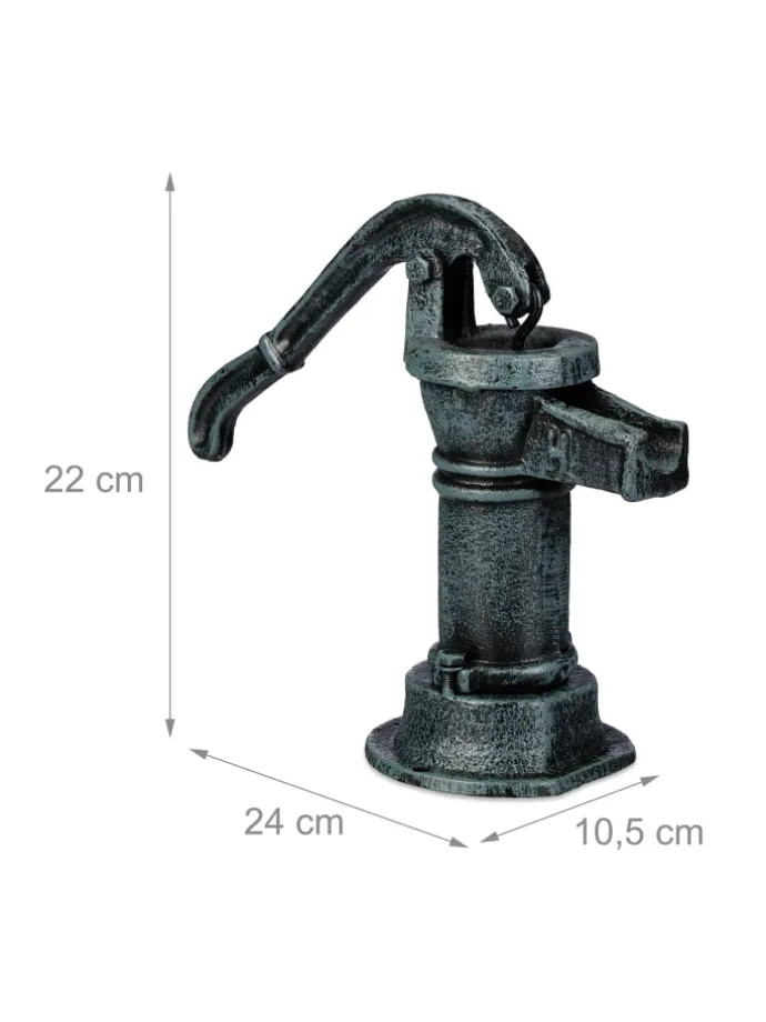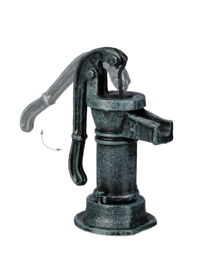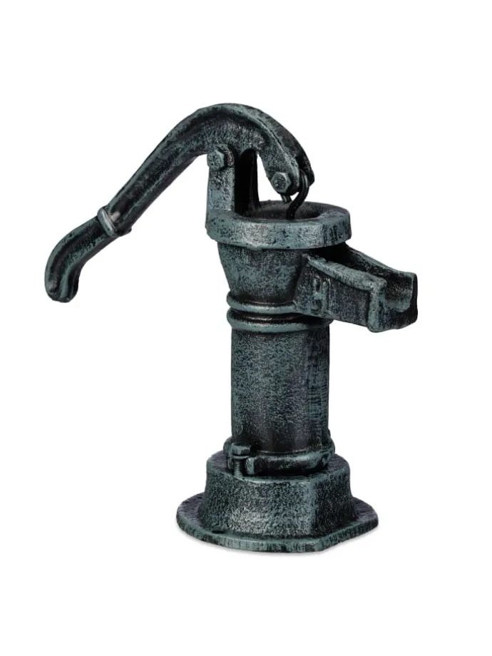 Mit dieser Deko Pumpe im Mini-Format bereicherst Du Deinen Garten um einen rustikalen Hingucker. Die Gusseisen Deko im Antik-Design ist einer klassischen Schwengelpumpe nachempfunden und besticht mit Ihrer Treue zum Original: Sogar der Hebel lässt sich bewegen. Platziere die Gartenpumpe zu Dekozwecken am Gartenteich oder wo immer Du willst und trage nostalgisches Flair in Dein grünes Reich. Auch eine Bodenmontage ist möglich, denn die Hebelpumpe ist am Sockel mit Bohrlöchern ausgestattet.