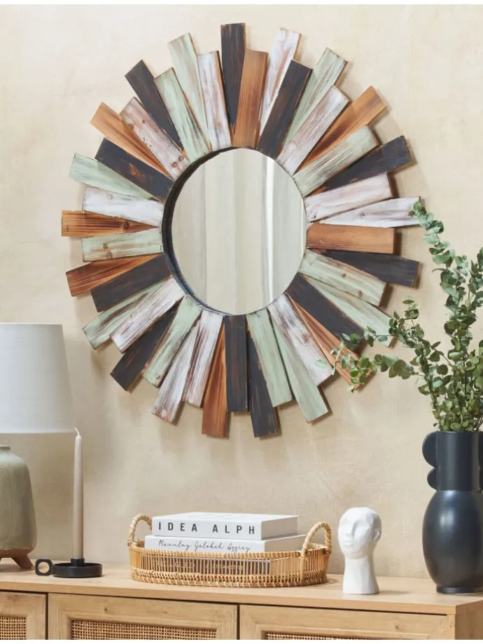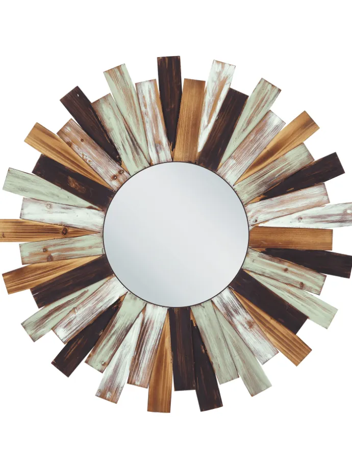Handgefertigter, runder Spiegel mit breitem Holzrahmen mit mehrfarbigen Akzenten. Setzen Sie auf die handgefertigte Schönheit dieses Hängespiegels und machen Sie Ihre Wände genauso Einzigartig wie er selbst es ist. Er besteht aus verschiedenen Holzstücken, die nicht nur mit ihrer natürlichen Maserung, sondern auch mit den von weiß-, braun- bis grüntönigen Destails auffält. Das handgemalte Sonnen-Design macht ihn zu einen Unikat, das keiner außer Ihnen in seiner Wohnung haben wird. Es liegt ganz bei Ihnen wo Sie Ihn aufhängen werden – ob Wohn-, Schlaf- oder Esszimmer – eins ist Ihnen Gewiss: er wird auf jeden Fall ein stilvoller und funktionaler Blickfang sein.