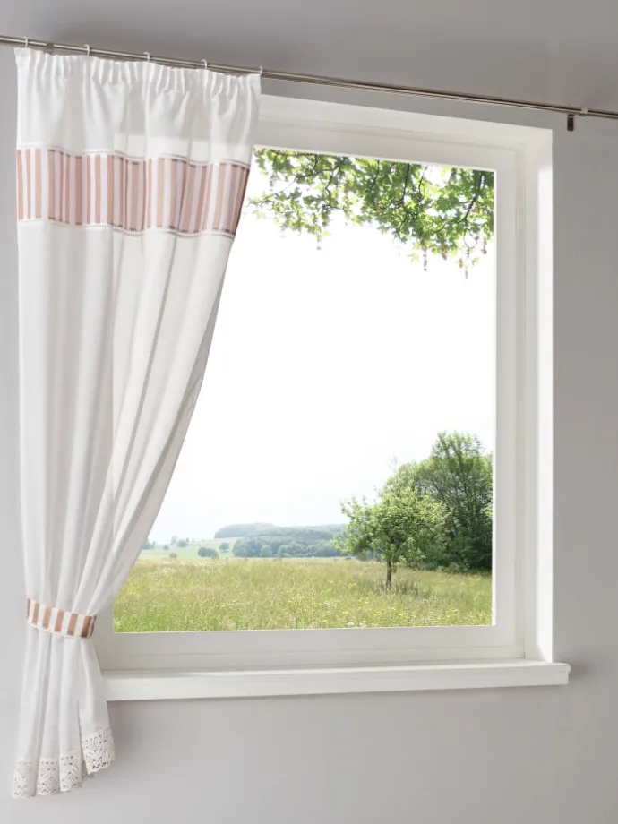 Dekostore Mit farblich abgesetzter Bordüre und dekorativer Häkelbordüre. Raffhalter mit Klettverschluss. 4-teiliges Set aus 2 Dekostores und 2 Raffhaltern. Weich fließende Qualität. Halbtransparent.