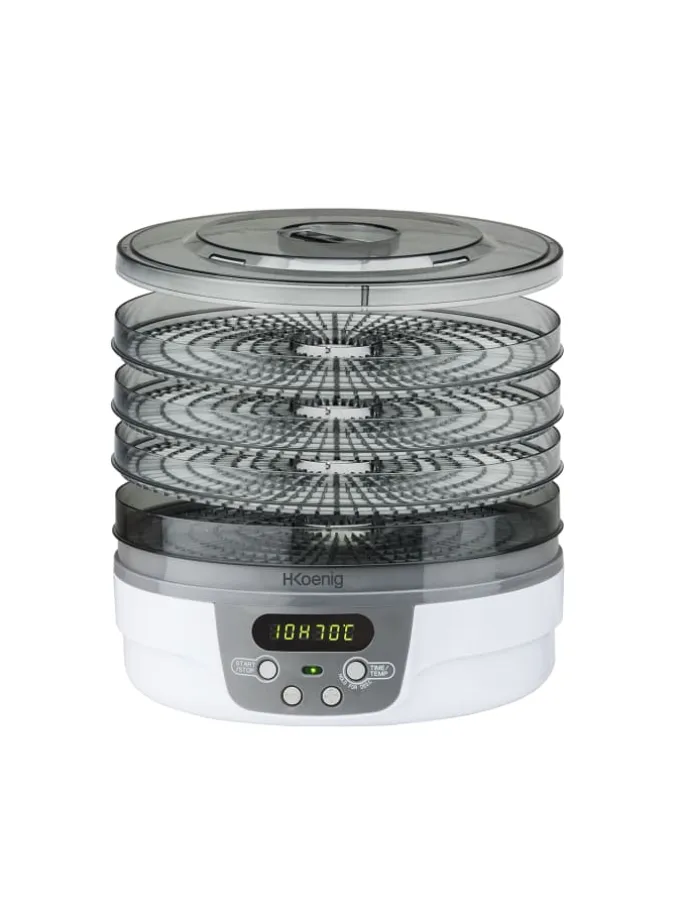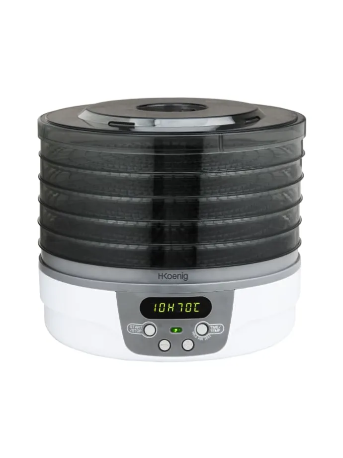 Der Dörrautomat von H.Koenig ist perfekt für die Zubereitung von getrocknetem Obst und Gemüse geeignet. Mit Hilfe des Geräts können Sie alle Aromen und Nährstoffe Ihrer Lebensmittel bewahren und diese auch auch außerhalb der Saison genießen. Ob Obst, Gemüse, Fisch, Fleisch oder Kräuter – der DSY700 von H.Koenig dehydriert alle Arten von Lebensmitteln. Sie können die Temperatur von 40° bis 70° bequem über den LCD-Bildschirm einstellen. Der DSY700 ist besonders effizient dank seiner fünf Trockenschalen und seines Belüftungssystems, das eine gleichmäßige Wärmeverteilung für ein perfektes Ergebnis auf allen Ebenen erlaubt. Der DSY700 von H.Koenig – ideal für eine hauseigene Zubereitung gesunder Snacks für die ganze Familie.250 W220-240 V