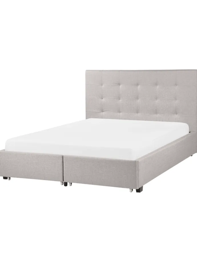 Hellgraues Polsterbett mit Bettkasten und stilvoller Knopfverzierung . Das weich gepolsterte Kopfteil mit der eleganten Knopfverzierung und den dekorativen Steppnähten lädt dazu ein, sich bequem an zu lehnen und noch eine Weile entspannt zu lesen. Der Bezug aus Polyester in edlem Hellgrau ist strapazierfähig und pflegeleicht. Der robuste, integrierte Lattenrost und die Füße aus langlebigem Kunststoff sorgen für zusätzliche Stabilität. Zudem besitzt das Doppelbett 2 praktische, ausziehbare Bettkästen, in denen Sie spielend leicht Kissen, Bettwäsche und andere Kleinigkeiten verstauen können.