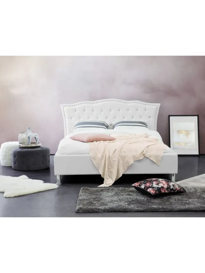 Romantisches Lederbett in stilvollem Weiß. Das wunderschöne Lederbett bietet Romantik und Eleganz pur! Die exklusive Ausstrahlung, das angenehm gepolsterte und wunderschön geschwungene Kopfteil mit der eleganten Knopfverzierung und den dekorativen Steppnähten sowie die schicken, verchromten Füße runden das stilvolle Design ab. Das Doppelbett hat einen strapazierfähigen und pflegeleichten Bezug aus hochwertigem Kunstleder in edlem Weiss. In diesem romantischen Lederbett werden Träume wahr!
