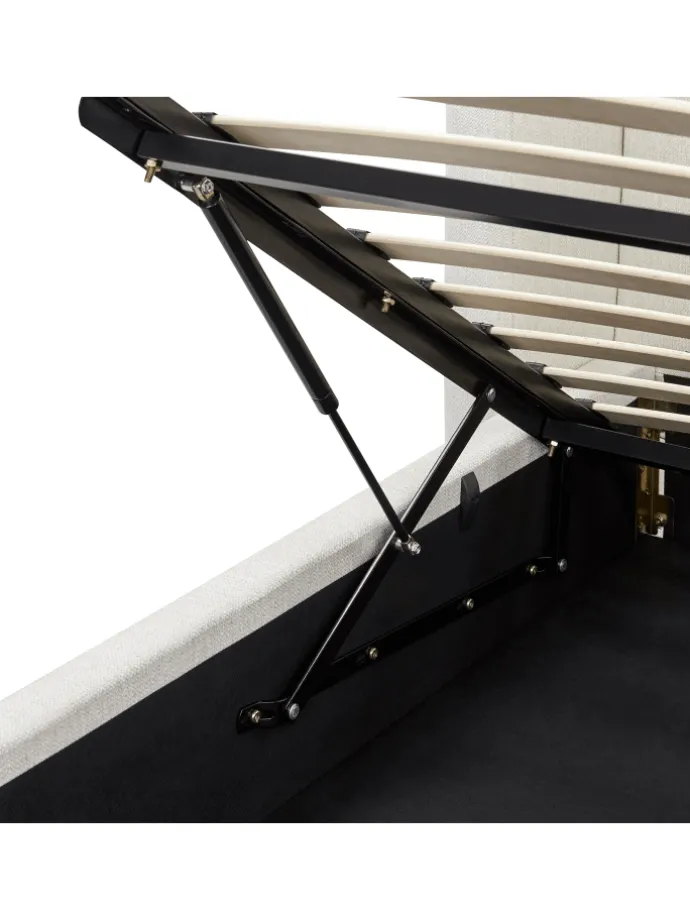 Modernes Doppelbett mit hochklappbarem Lattenrost und praktischem Stauraum. Dieses stilvolle Polsterbett verbindet Stil mit Funktionalität und sorgt für eine erholsame Nachtruhe. Es besitzt einen hochklappbaren Lattenrost und ein gestepptes, bequemes Ohren-Kopfteil, das so wie der Bettrahmen mit einem weichen, hochwertigen Stoffbezug ergänzt ist. Unter dem Lattenrost verbirgt sich ein geräumiger Bettkasten, in dem Sie Bettwäsche oder andere Dinge ordentlich und blickdicht verstauen können. Die integrierte Gasdruckfeder und das am Lattenrahmen angebrachte Griffband sorgen für besondere Nutzfreude.