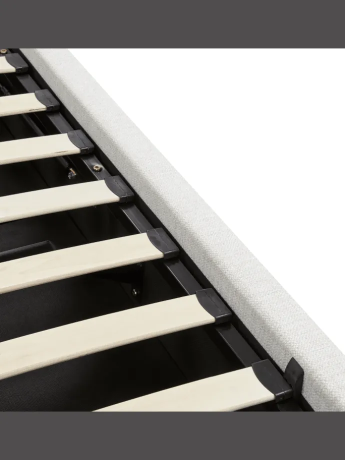 Stoßdämpfende Federholzleisten bieten höchsten Liegekomfort, Komfortable und breite Liegefläche, Hochwertiges Polster, Stabile Konstruktion des Gestells, Praktische Abstellfläche