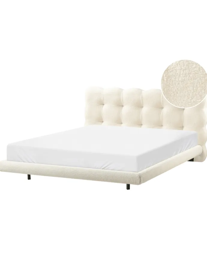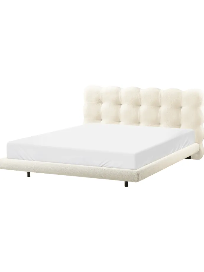 Polsterbett mit niedrigem Rahmen und gestepptem Kopfteil. Verwandeln Sie Ihr Schlafzimmer in eine stilvolle Wohlfühloase mit diesem eleganten und niedrigen Bettgestell. Der Rahmen ist mit weichem Bouclé-Stoff bezogen, während das gepolsterte, gesteppte Kopfteil für hohen Komfort und eine moderne, minimalistische Note sorgt. Dank des stabilen Lattenrosts und der robusten Metallbeine bietet dieses Bett nicht nur optisch, sondern auch funktional eine ideale Schlaflösung – passend für verschiedenste Einrichtungsstile.