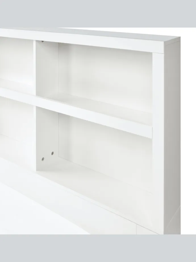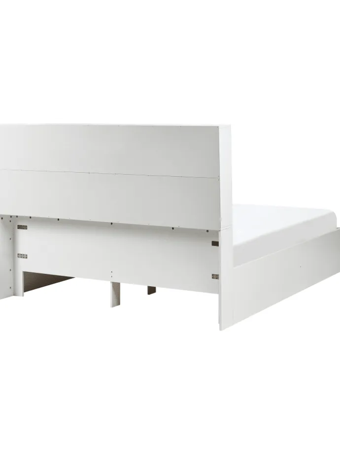 Funktionales Bettgestell mit Bücherregal. Ein praktisches und stilvolles Bett, das den vorhandenen Raum optimal nutzt. Zwei praktische Schubladen unter dem Bett bieten Platz für Bettwäsche oder andere wichtige Utensilien. Die Regalfächer im Kopfteil eignen sich ideal für Ihre Lieblingsbücher oder dekorative Wohnaccessoires. Das schlichte, elegante Design passt zu unterschiedlichen Einrichtungsstilen und macht das Bett zur perfekten Wahl für jedes moderne Schlafzimmer.