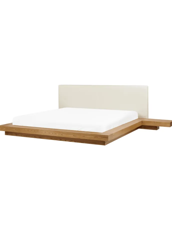 Exklusives Bett im japanischen Stil. Großzügig, komfortabel und mit klaren Linien bringt dieses herrlich komfortable und elegante Futonbett im japanischen Stil Ruhe und Ausgeglichenheit in Ihr Schlafzimmer. Der natürliche, warme Holzfarbton harmonisiert ausgezeichnet mit dem weißen Kunstleder der beiden Kopfteile und den zwei, flachen Nachttischen an den Seiten. Der stabile Lattenrost sorgt zusätzlich für eine perfekte Klimatisierung.