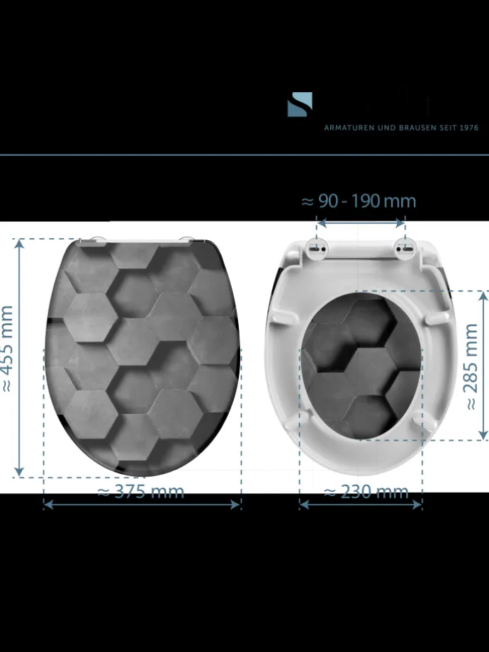 UNIVERSALE FORM: Dank universellem Standardmaß und O-Form passt der WC-Sitz auf handelsübliche Hänge- und Stand WC-Becken (Details zu der Bemaßung in technischer Zeichnung).