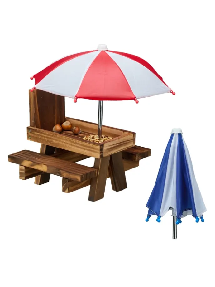 Mit der Eichhörnchen-Futterbank bietest Du den Nagetieren einen lecker gedeckten Tisch und unterstützt sie beim Sammeln und Aufstocken ihrer Wintervorräte. Dazu kann der Futtertisch mit artgerechter Nahrung wie Nüssen, Samen und Obst befüllt werden. Platziere die Futterstation im Garten oder auf dem Balkon und beobachte die kleinen Nager beim Fressen. Das niedliche Design in Form eines Picknicktischs mit Schirm macht den Eichhörnchen-Futterplatz zu einem tollen Hingucker.
