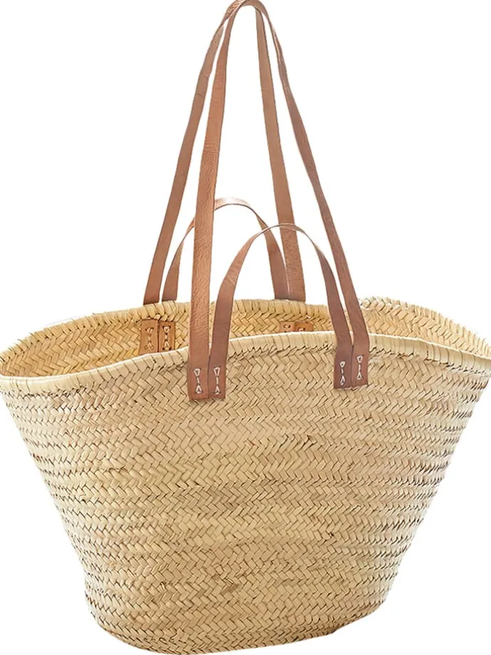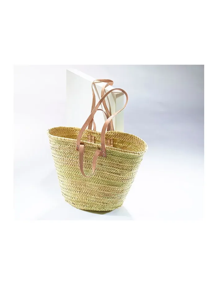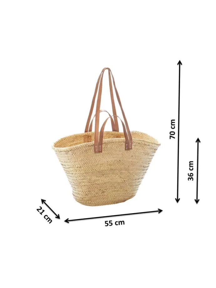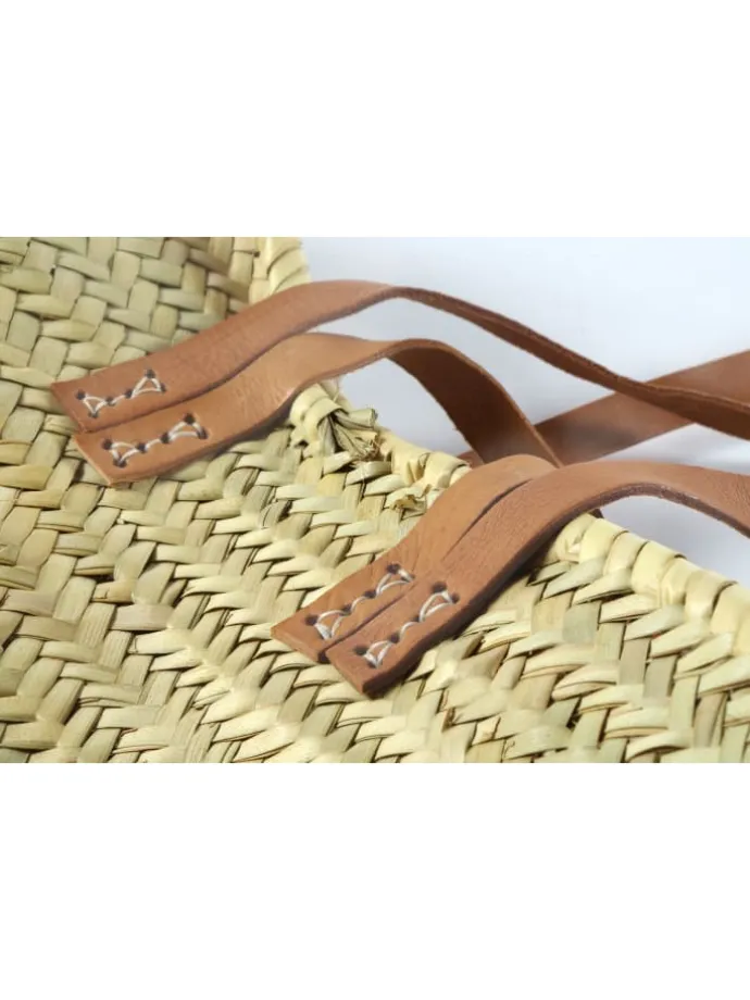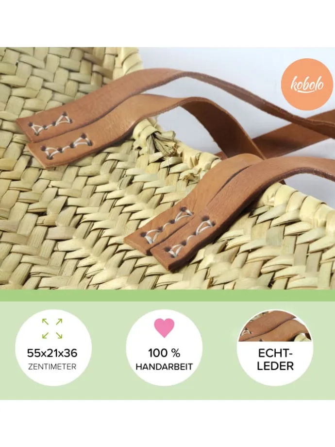 Diese elegante Palmblattasche von Kobolo, die durch ihre natürliche Optik besticht, kombiniert den rustikalen Boho-Charme von geflochtenen Palmblättern mit robusten Lederhenkeln, was sie zu einer stilvollen und umweltfreundlichen Wahl für den Alltag macht. Ideal sowohl für den Einkauf als auch für den Strand, bietet sie durch ihr leichtes, jedoch strapazierfähiges Design eine perfekte Balance zwischen Funktionalität und Ästhetik. Die in 100% Handarbeit hergestellte Tasche, wird in einer Spiraltechnik aus einem Palmblattzopf geflochten – Technisch bedingt wird das Ende des Zopfes schräg in den Rand der Tasche eingeflochten. Da es sich um ein in 100% Handarbeit aus Naturmaterialien hergestelltes und geflochtenes Produkt handelt, kann es zu Abweichungen in Form, Farbe und Größe kommen. Dies ist kein Mangel sondern durch die natürlichen Materialien bedingt und ein Zeichen der Handarbeit. Abweichungen von der fotografischen Darstellung sind naturbedingt und Zeichen der Handarbeit.